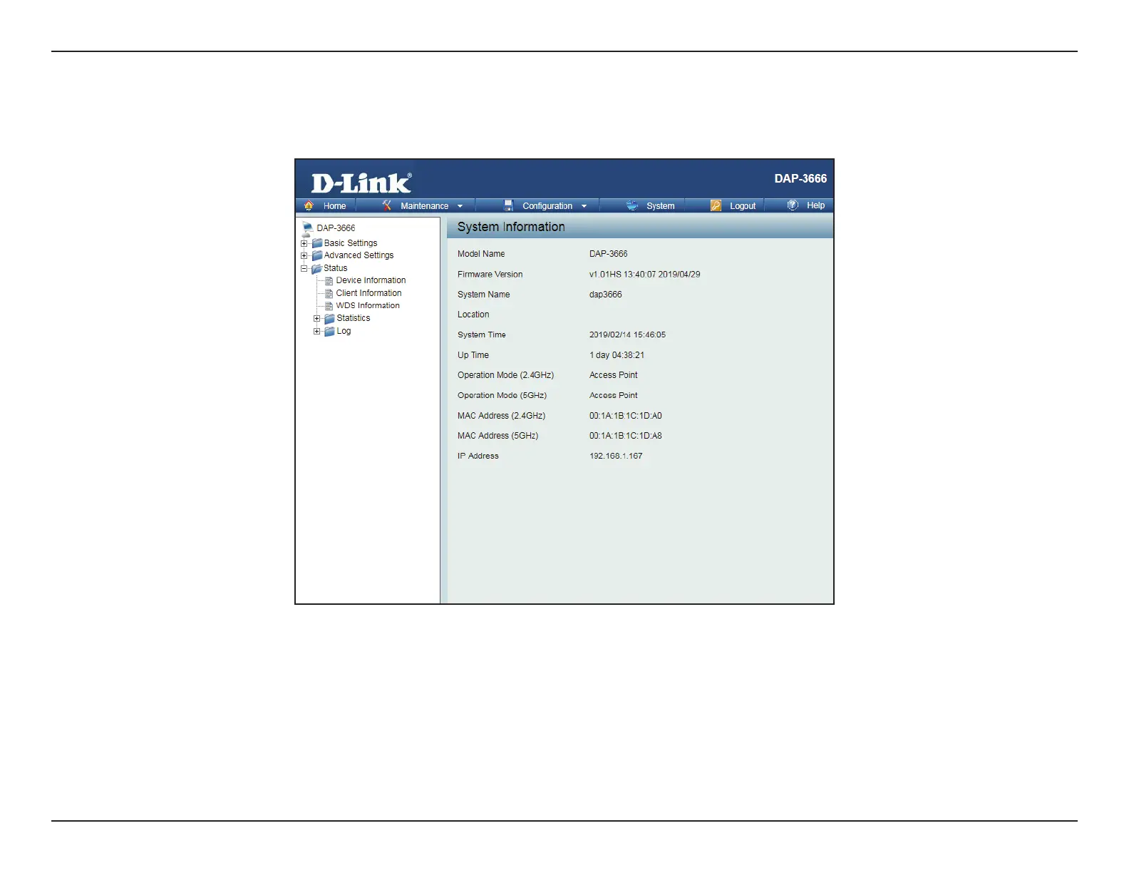 In the Status Section, users can monitor and view conguration settings of the access point. Here the user can also view statistics about client