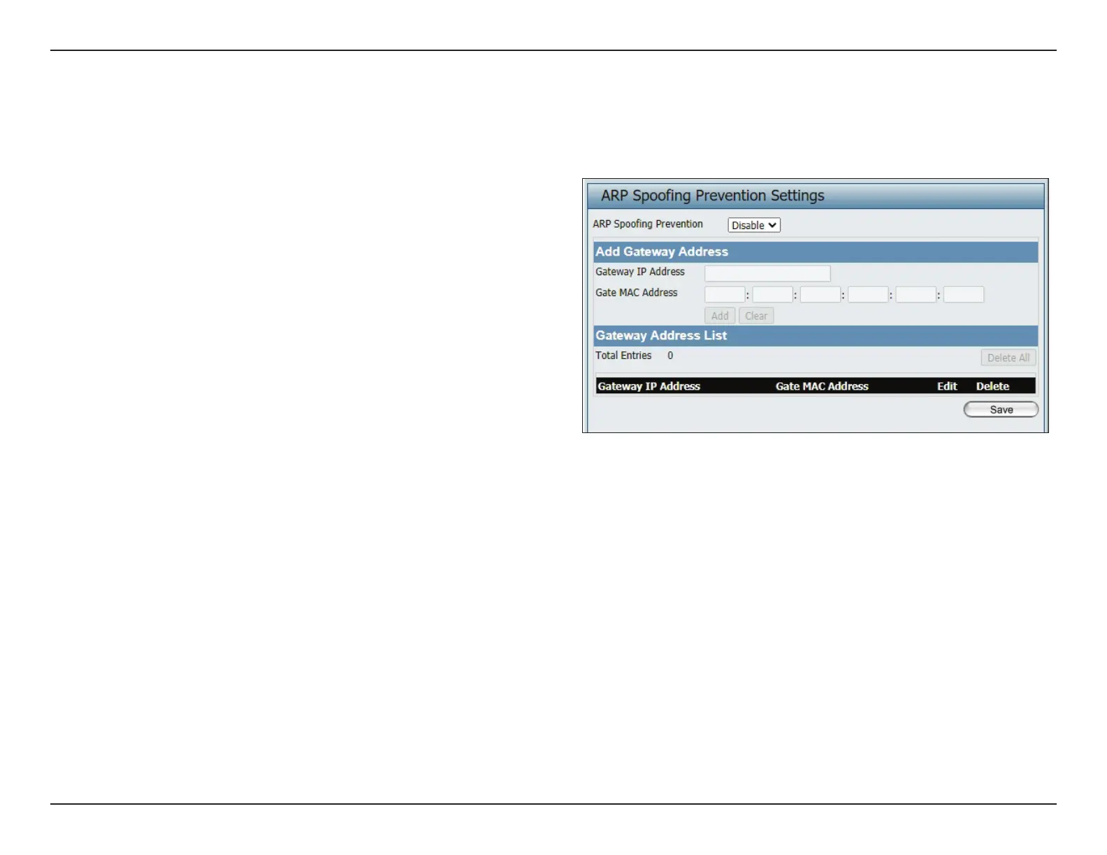 The ARP Spoong Prevention feature allows users to add IP/MAC address mapping to prevent ARP spoong attacks.