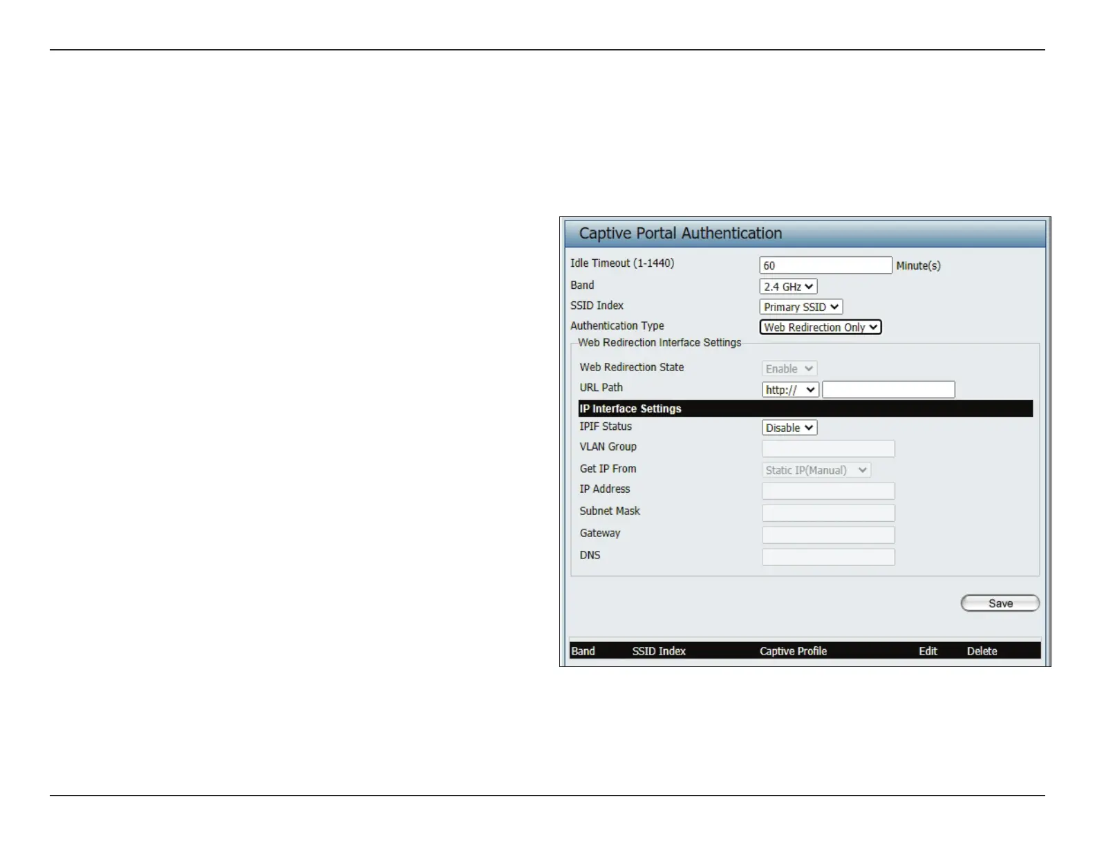 page. In this window, users can view and congure the Captive Portal settings. After selecting Web Redirection Only as the Authentication Type,