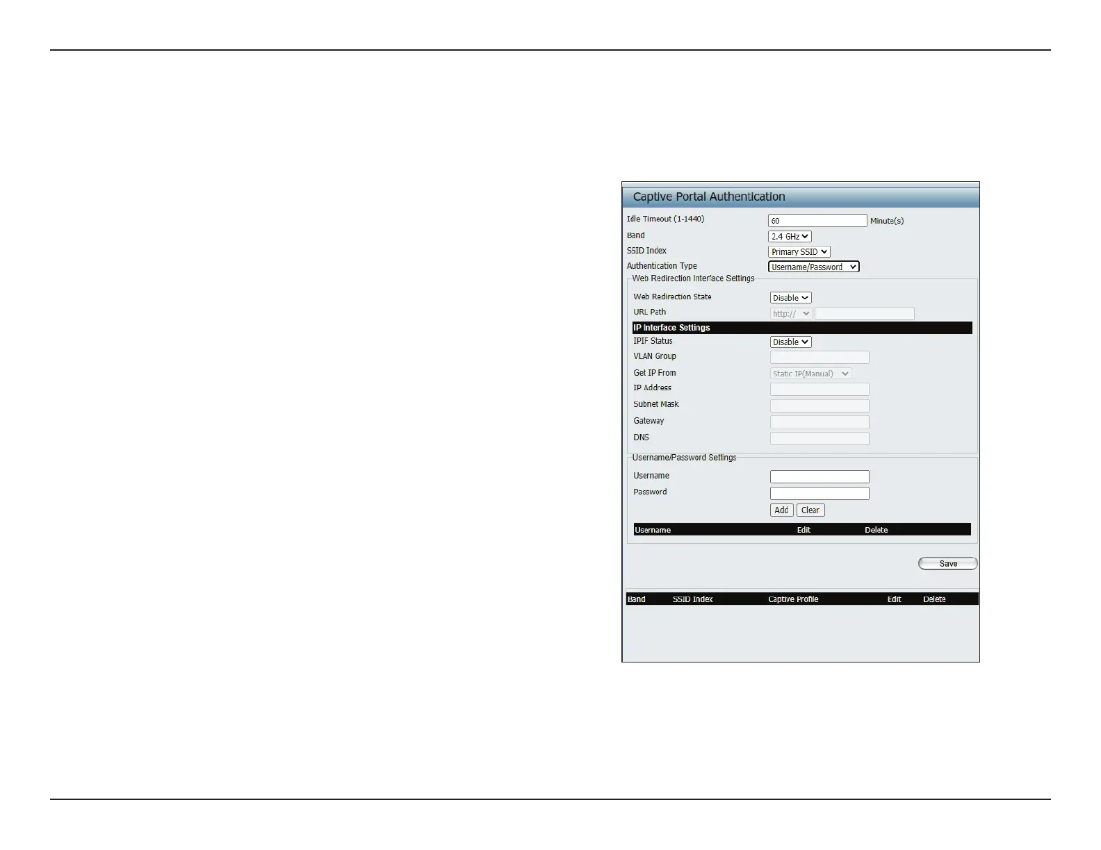 page. In this window, users can view and congure the Captive Portal settings. After selecting Username/Password as the Authentication Type, we