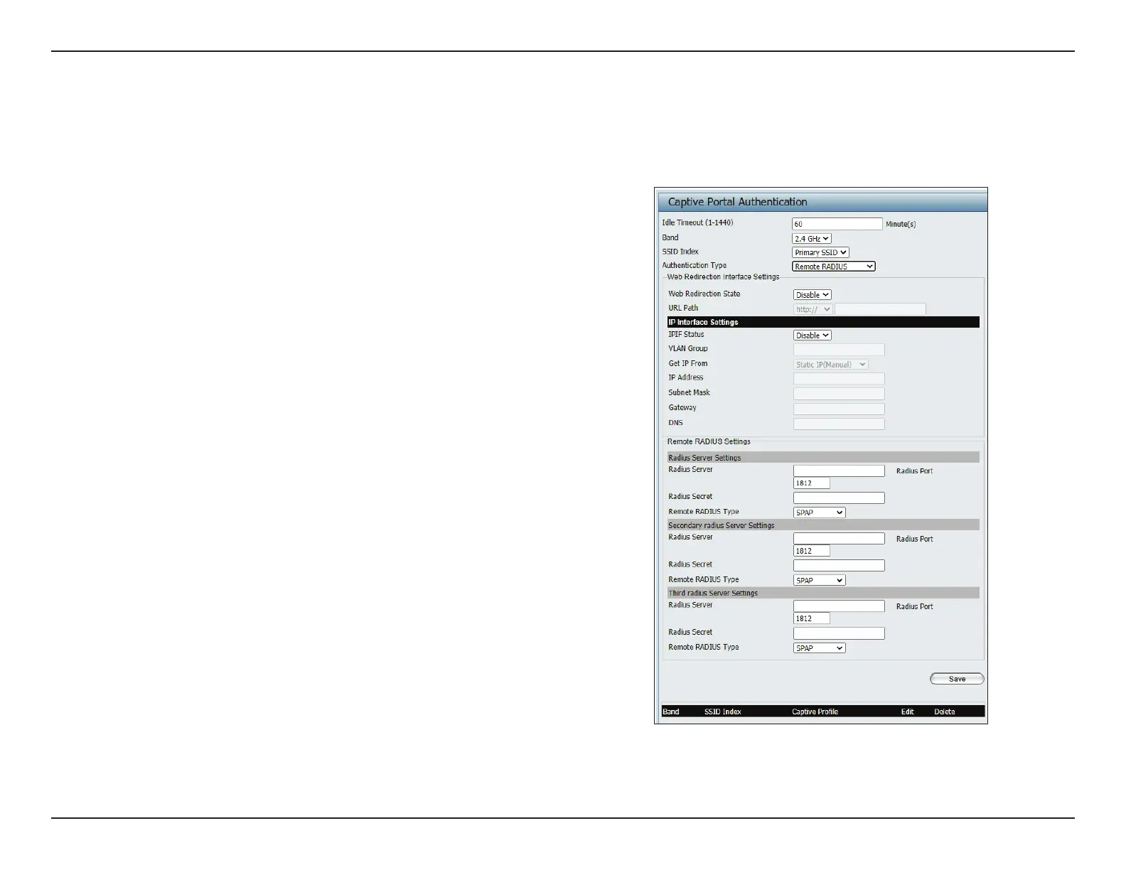 page. In this window, users can view and congure the Captive Portal settings. After selecting Remote RADIUS as the Authentication Type, you can