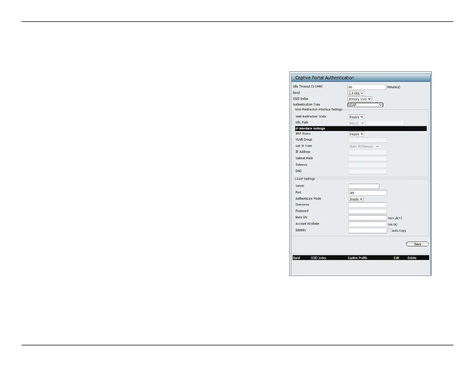 page. In this window, users can view and congure the Captive Portal settings. After selecting LDAP as the Authentication Type, you can congure