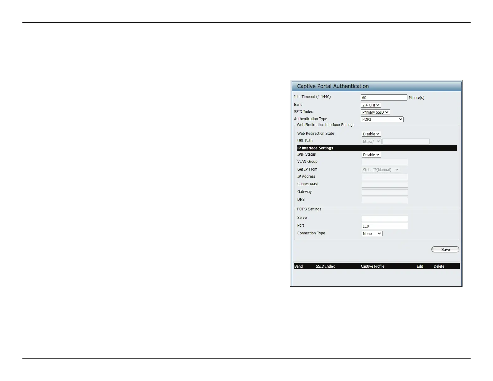 page. In this window, users can view and congure the Captive Portal settings. After selecting POP3 as the Authentication Type, you can congure