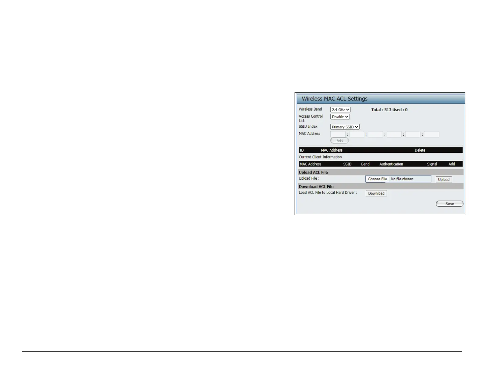 This page allows the user to congure Wireless MAC ACL settings for access control.