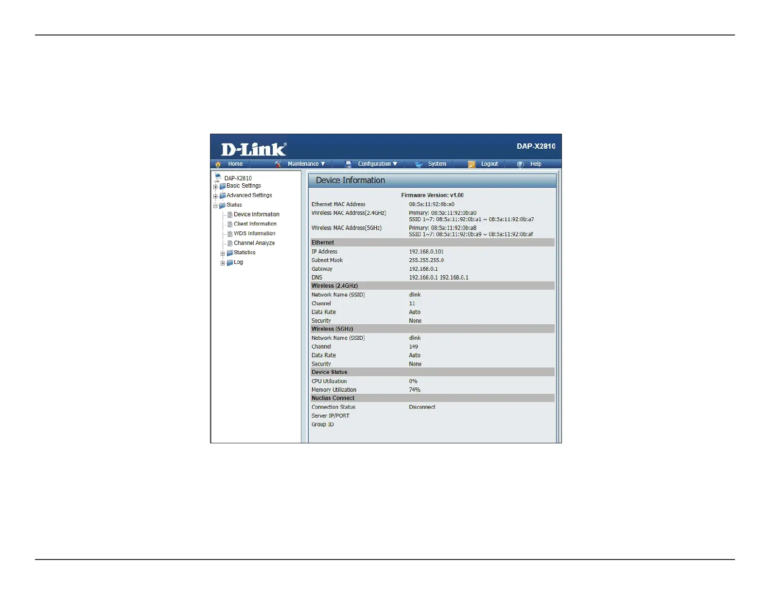 client information, WDS information and more. The following pages will explain settings found in the Status section in more detail.