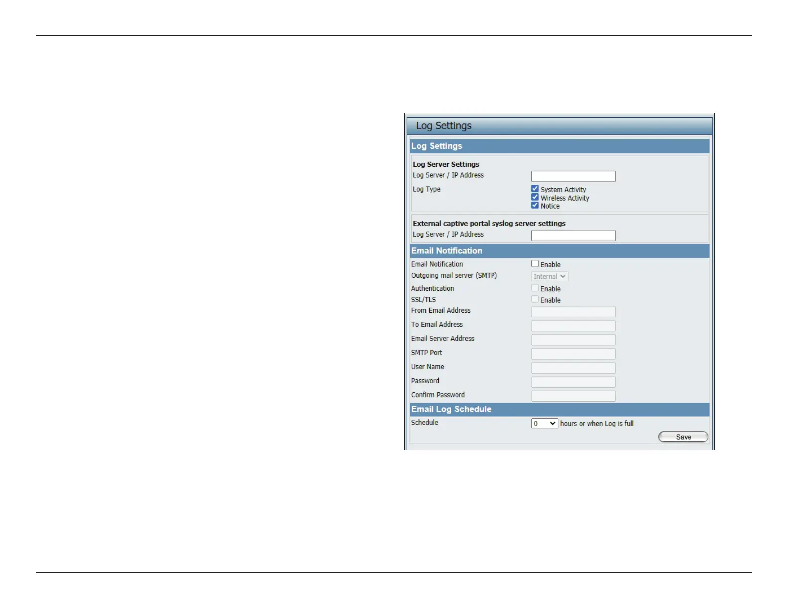 Enter the log server’s IP address to send the log to that server. Check or uncheck System Activity, Wireless Activity, or Notice to specify what kind