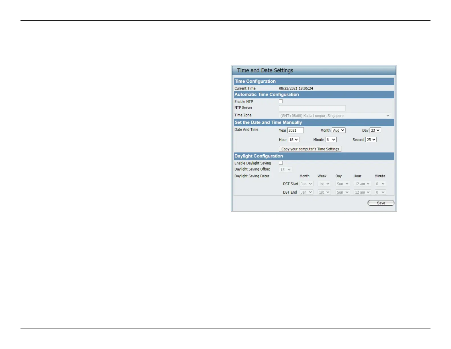 Enter the NTP server IP, choose the time zone, and enable or disable daylight saving time.
