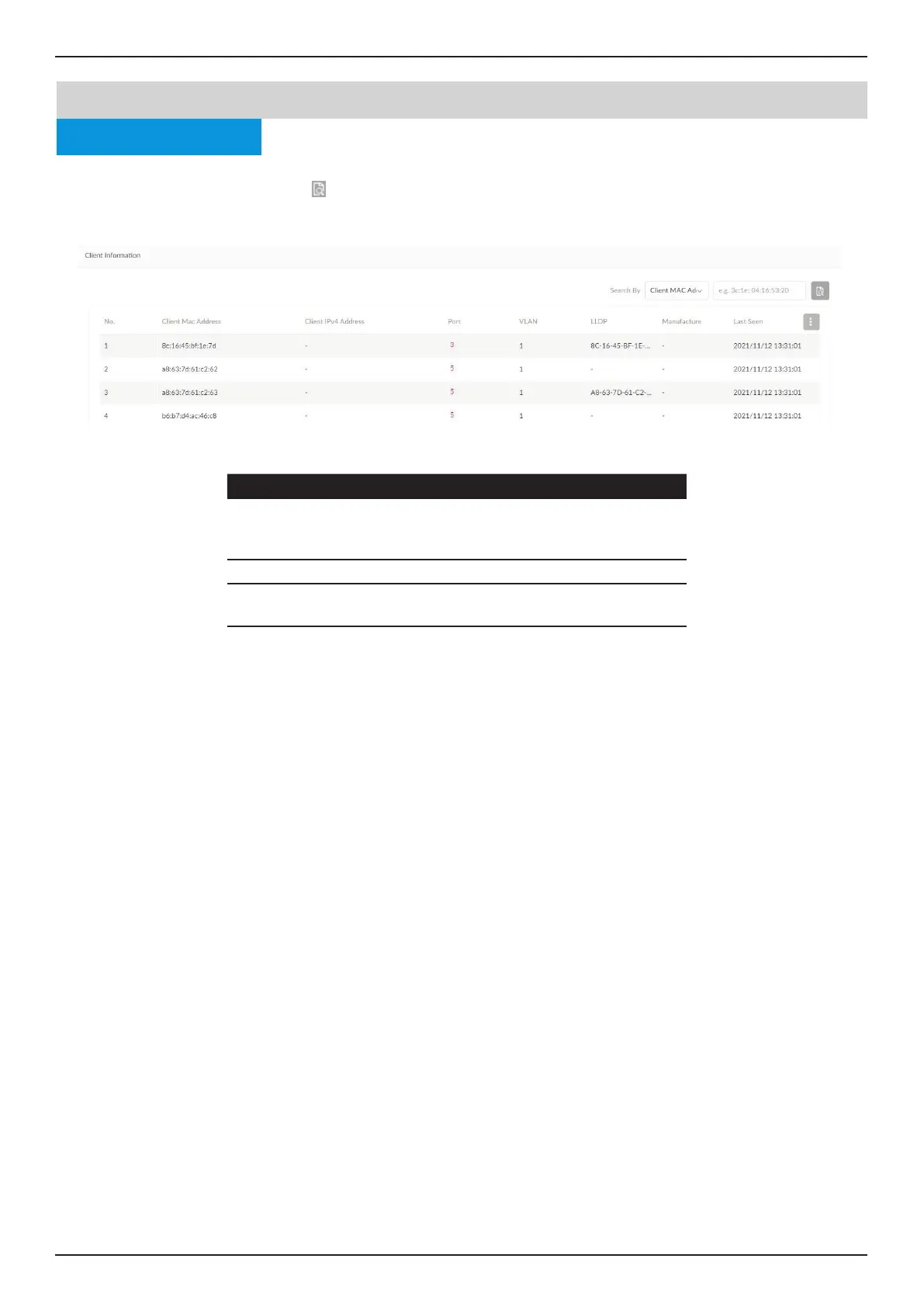 ber, Site, Network, Client MAC Address, Client IPv4 Address, Port, VLAN, LLDP, Manufacture, and Last Seen.