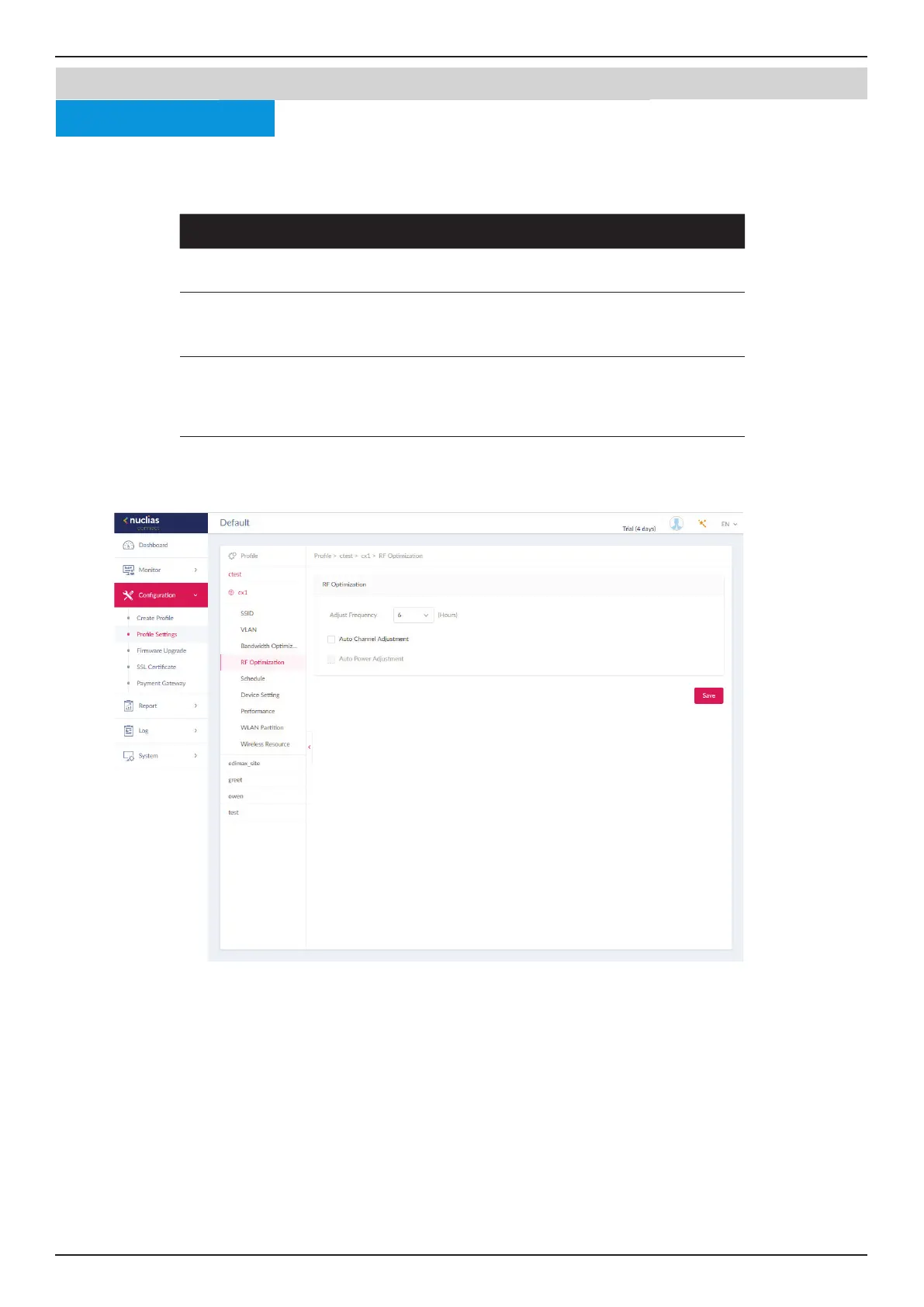 network. Navigate to Conguration > Prole Settings > [Site] > [Network] > RF Optimization to view existing settings.