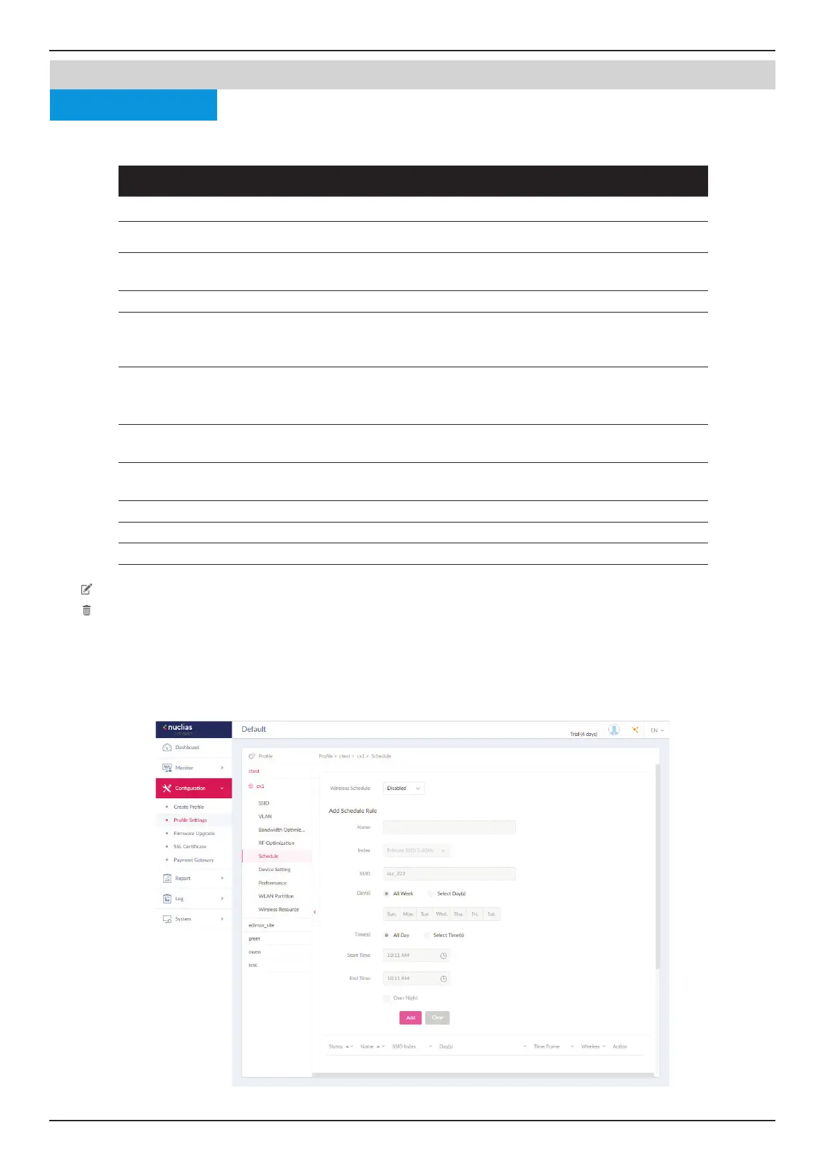 Under the Schedule page, you can congure a schedule to keep the SSID active within a specied time. Navigate to Conguration