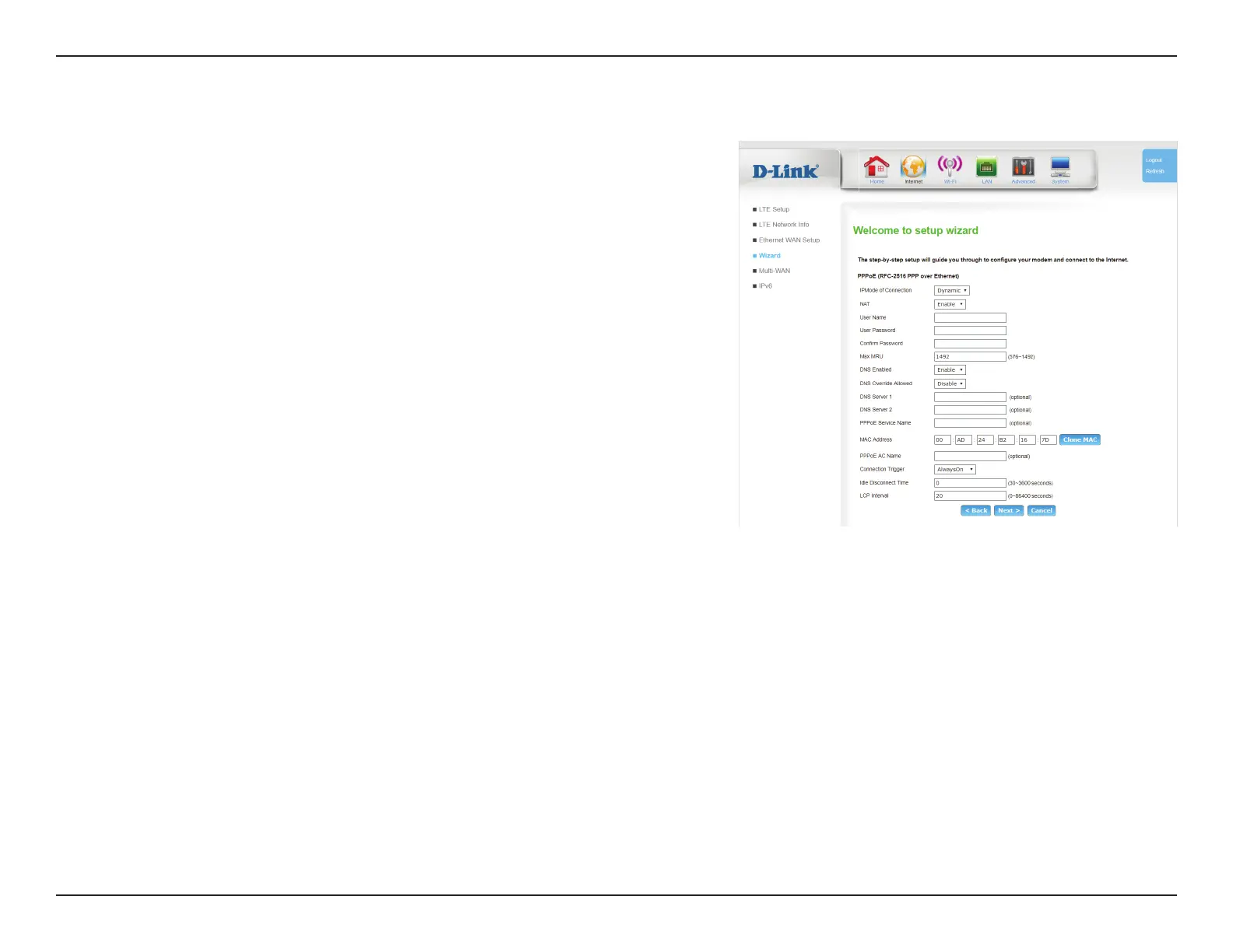 If you previously selected PPPoE (RFC-2516 PPP over Ethernet), ll in the below