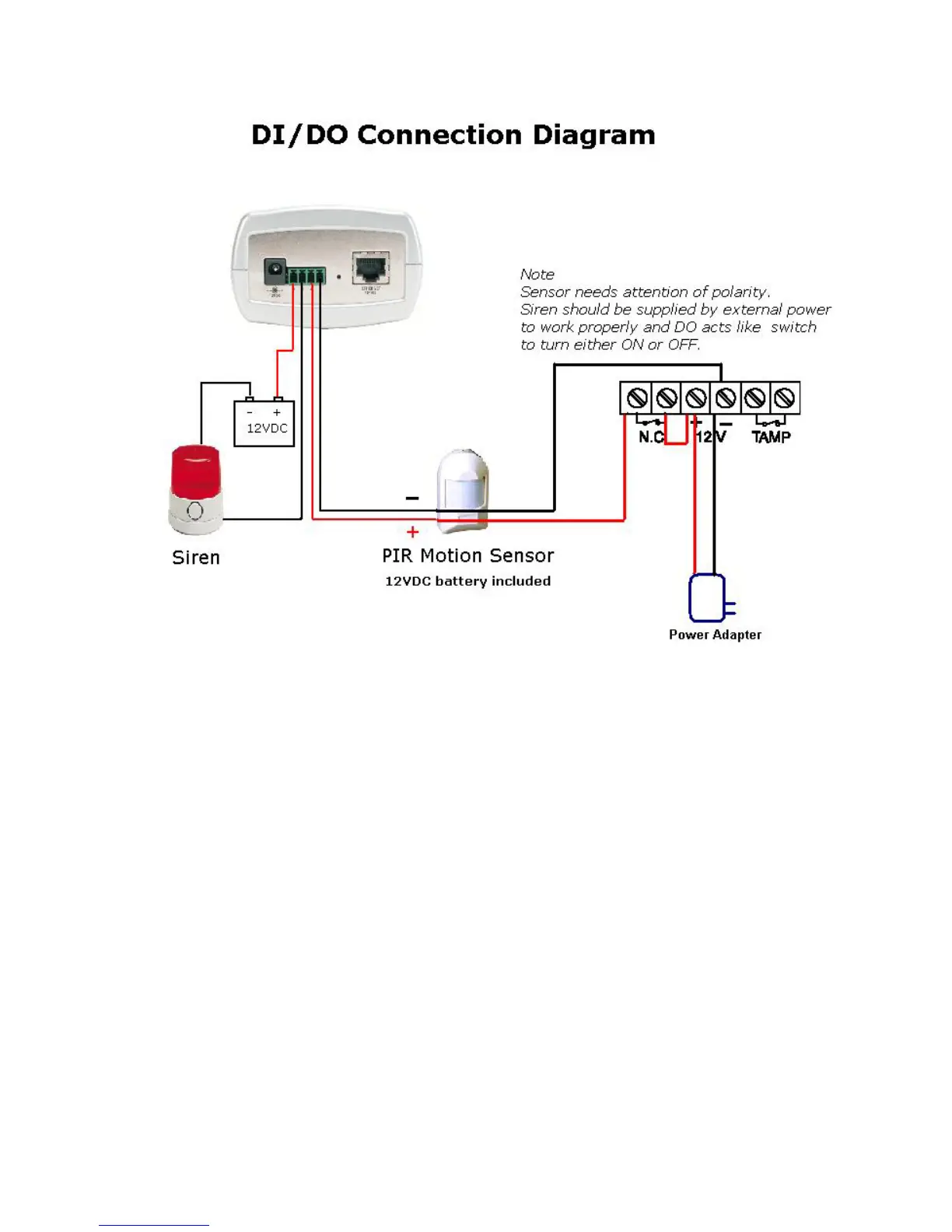 installation. Note that the positive from the PIR is connected to the D- of the I/O