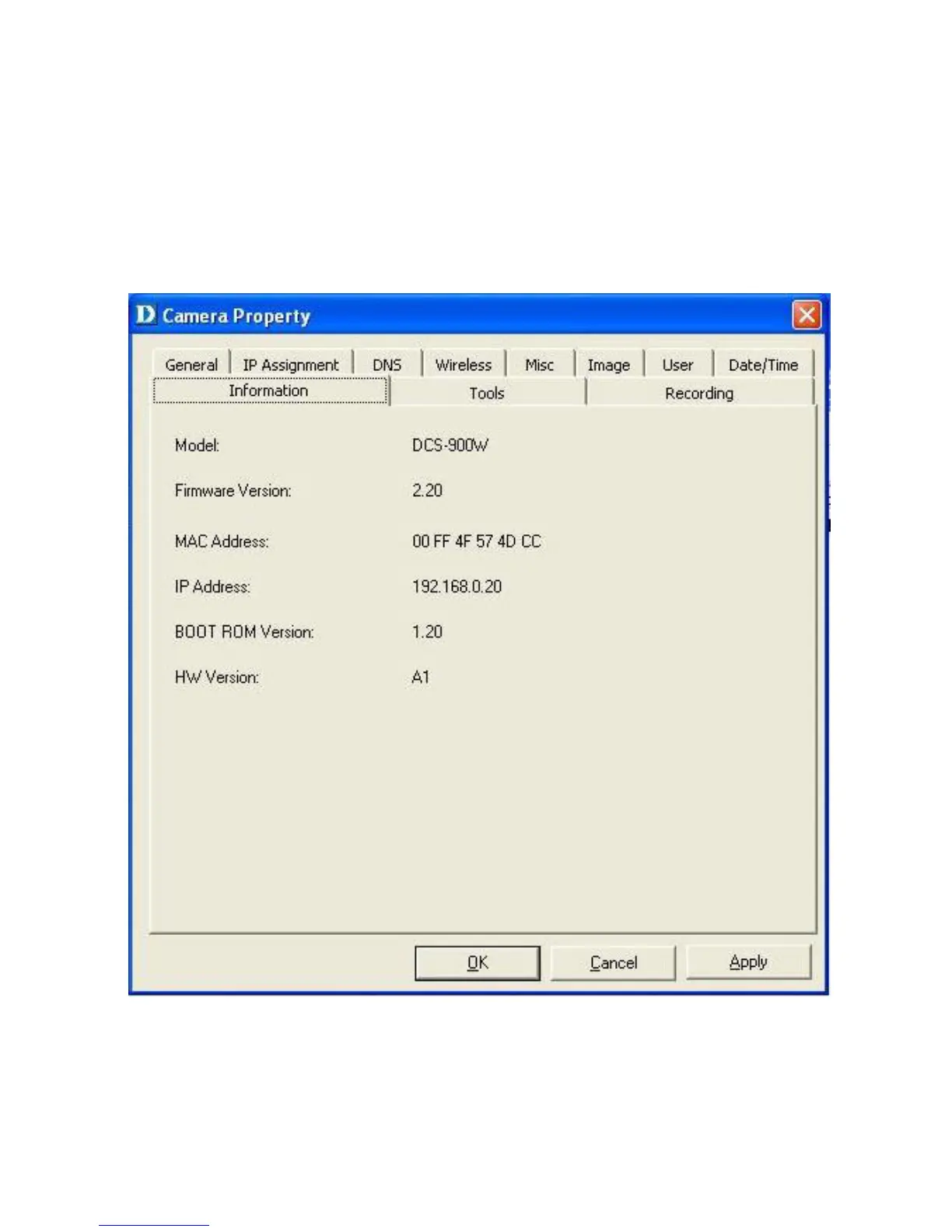 and IP address. Please refer to the DCS-900W Configuration section under Status on