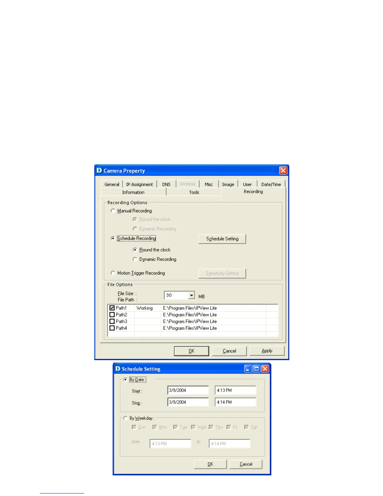 dates, Start, and Stop Times. The camera will start to record according to the specified