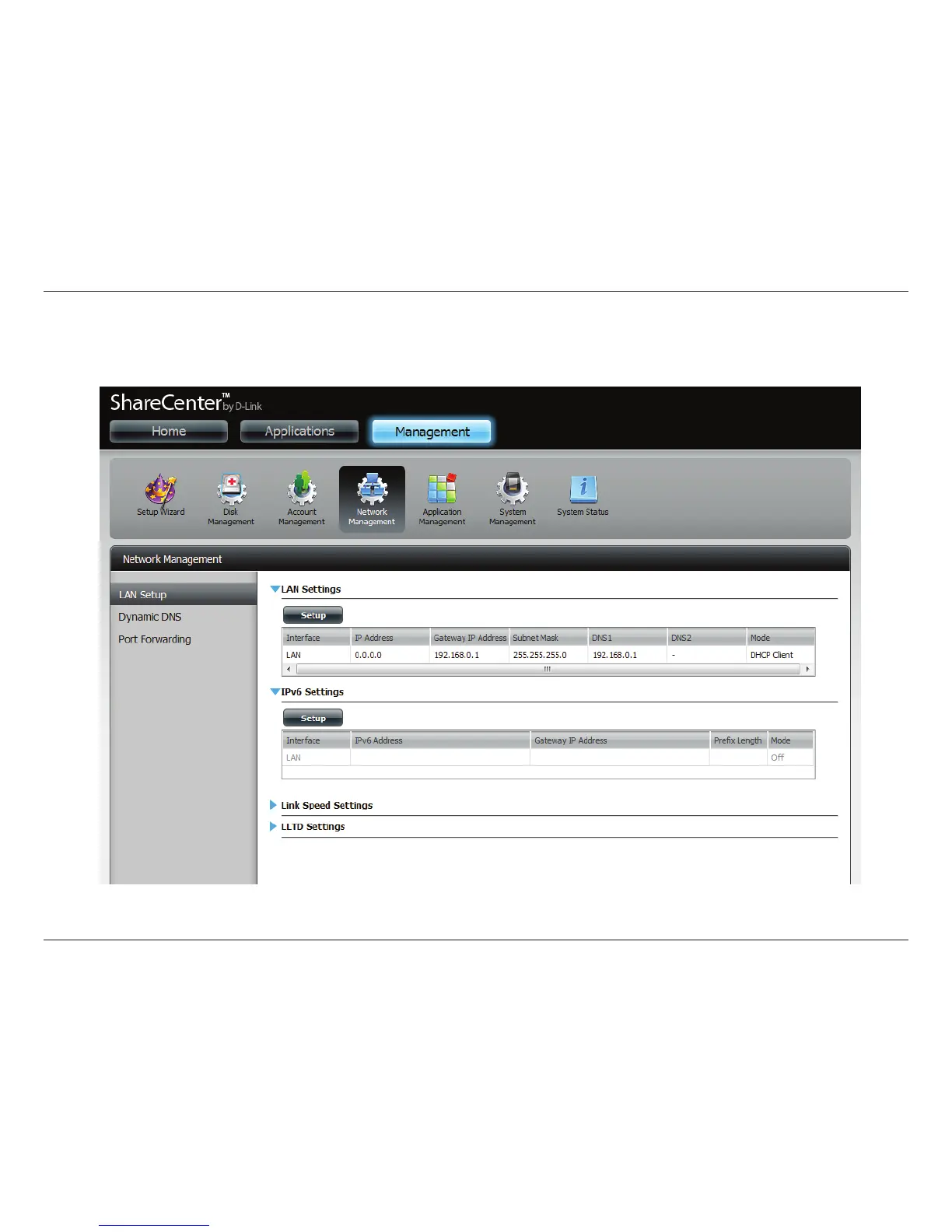 Go to Management > Network Management > LAN Setup > IPv6 Settings and click the Setup button. An IPv6 setup window will appear.