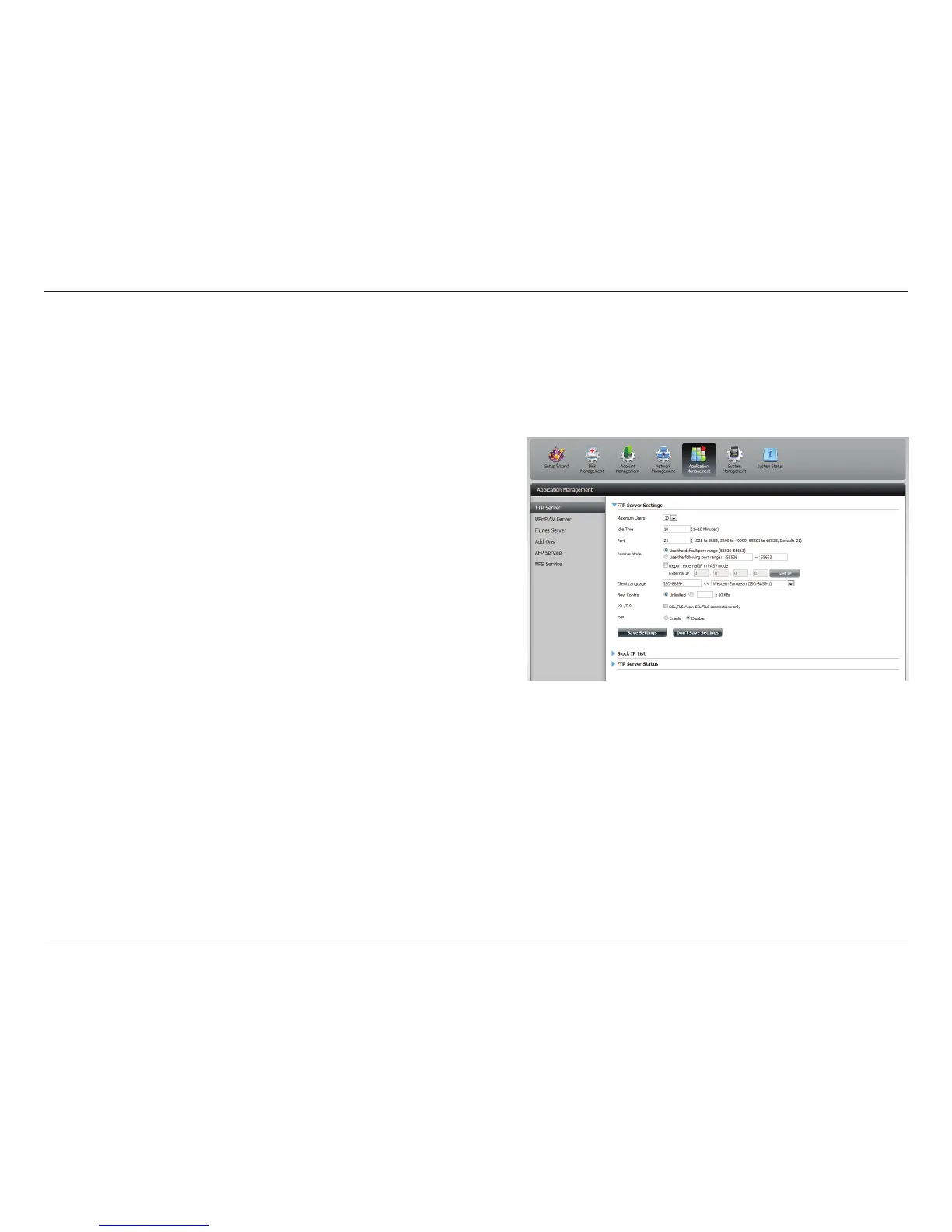 The Application Management section allows you to congure many services for your DNS-320. The server and service settings include: FTP server,