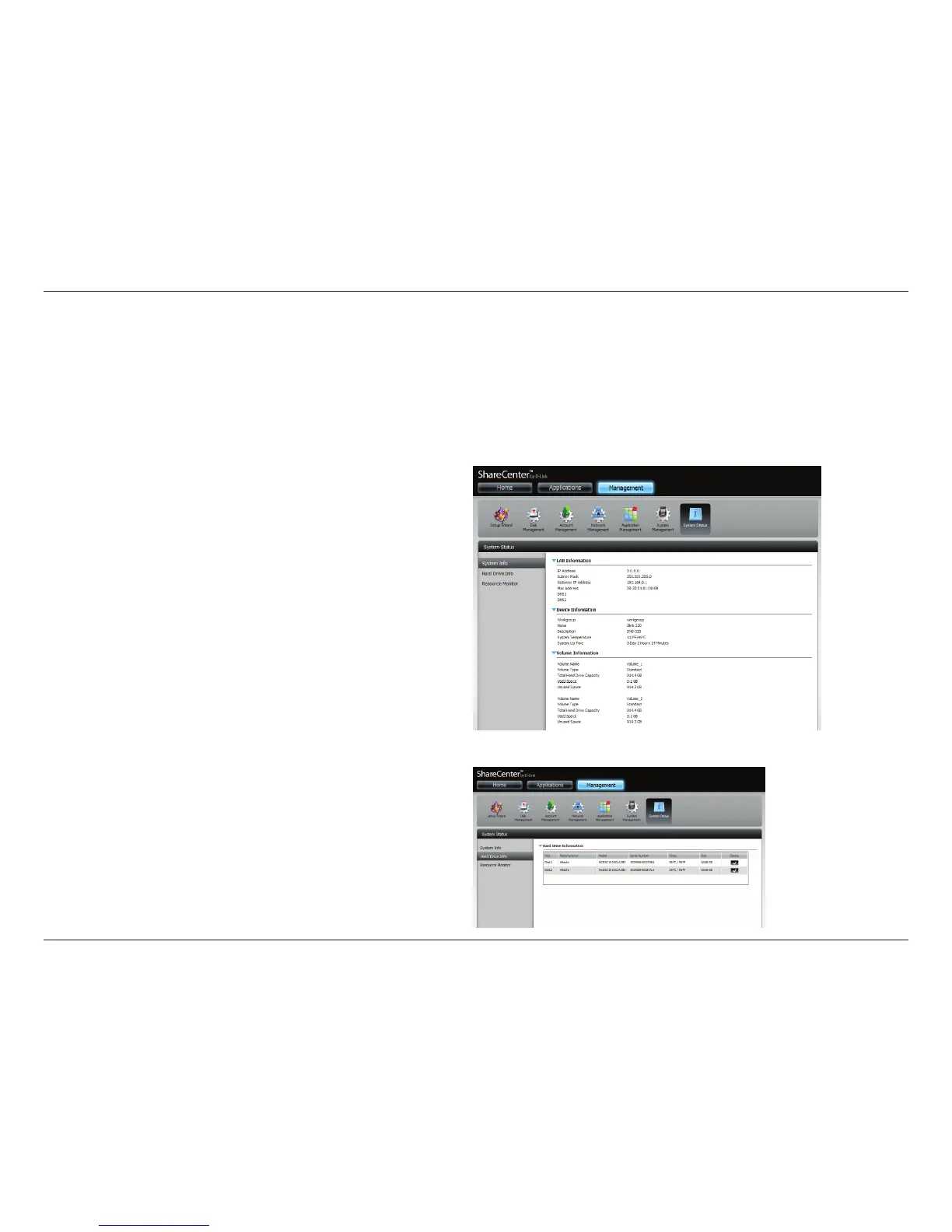 The System Status information screen provides information on the DNS-320. System Info provides information on the LAN ports, Device Information,
