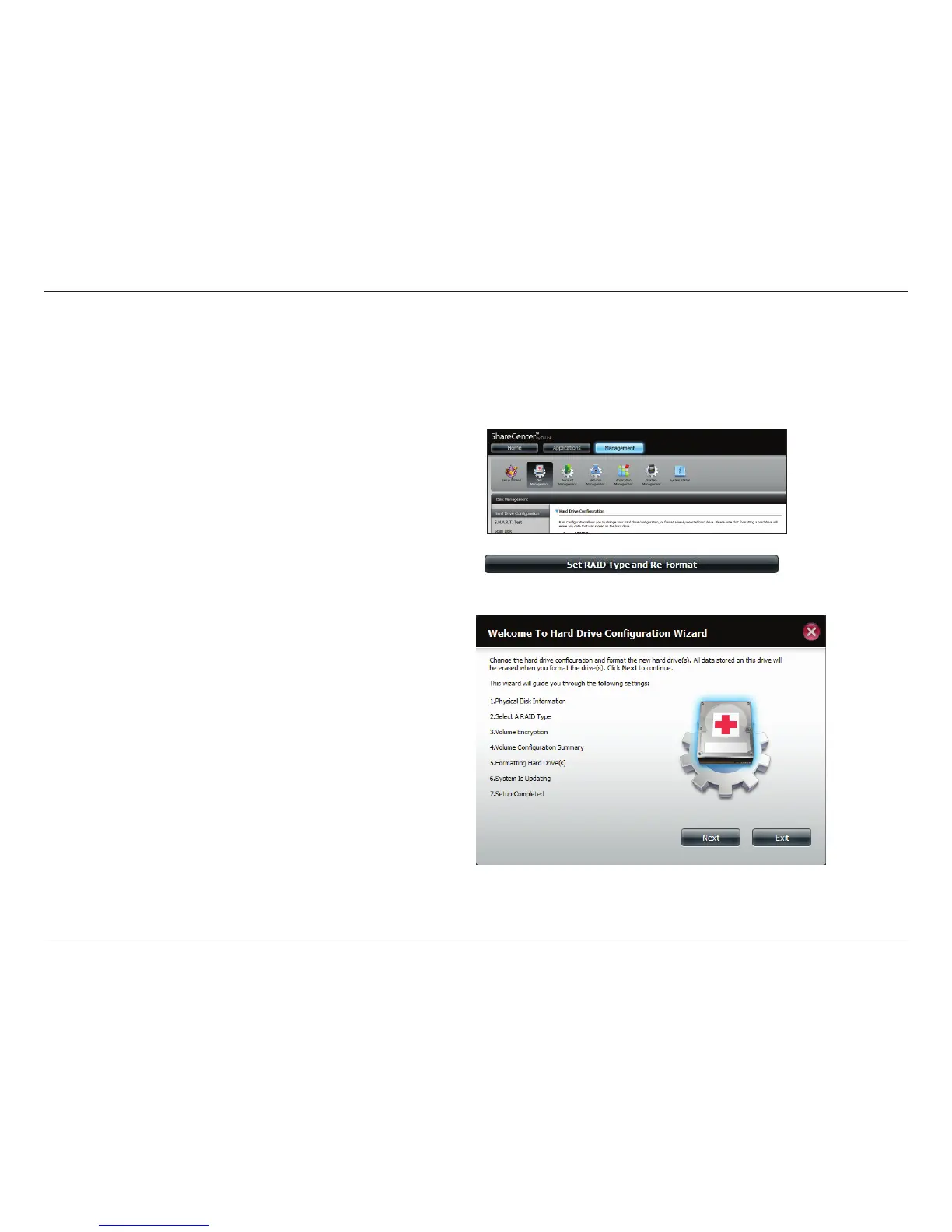 When you click on the Set RAID type and Re-Format button in the Disk Management-Hard Drive Conguration menu a wizard will start, allowing