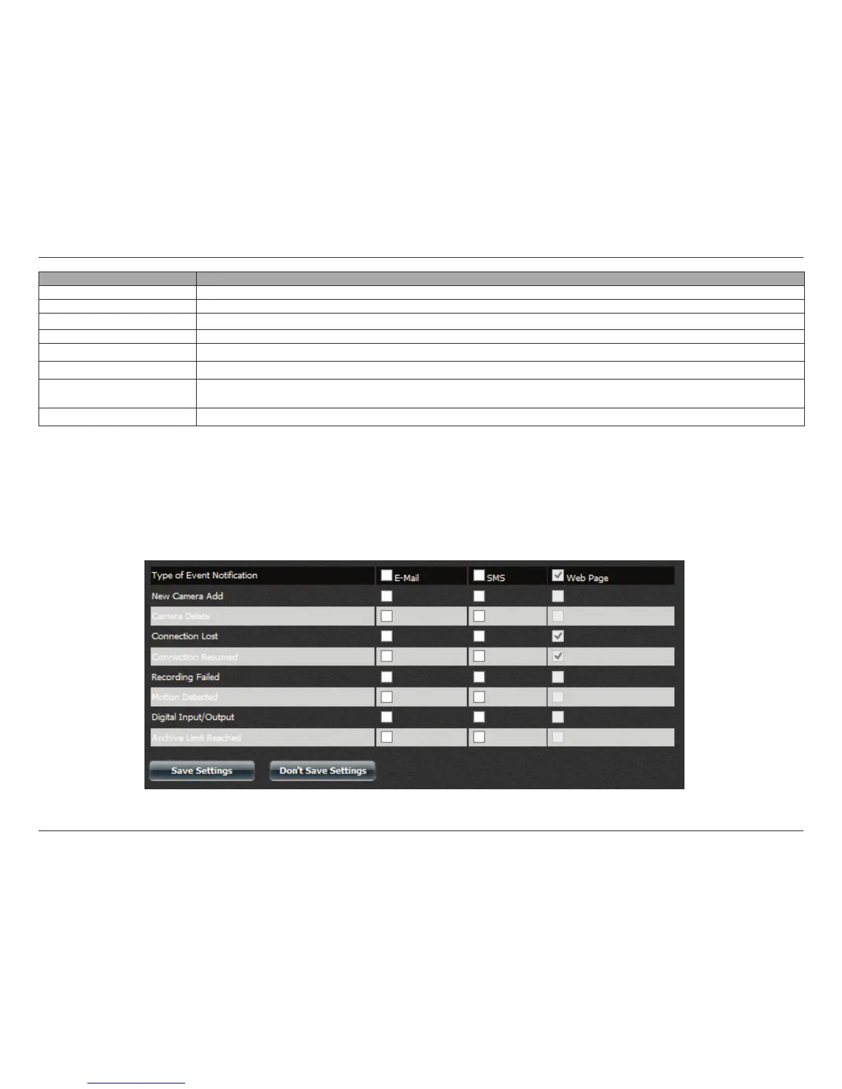 Use the checkboxes to select whether you would like each event type notication to be sent by E-mail, SMS, or Web Page. You can select more
