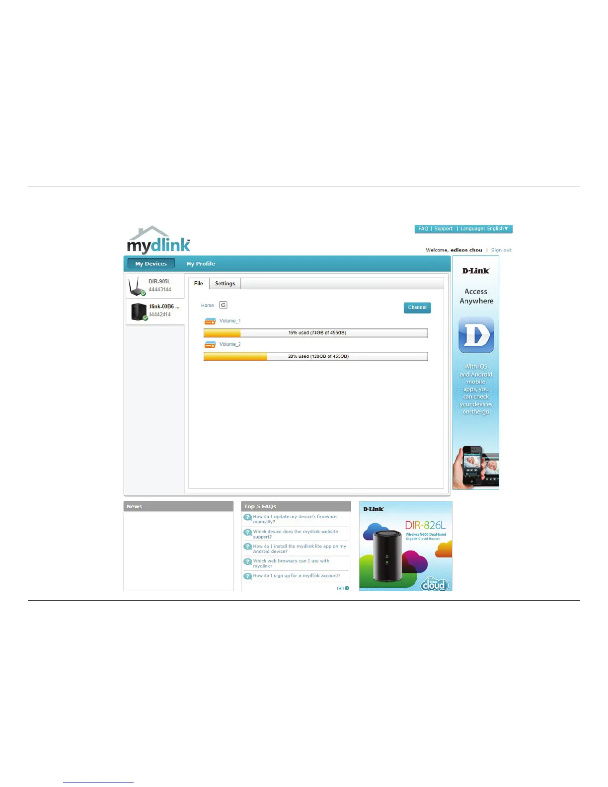 Once you are connected you can view your existing storage on the cloud and the DNS-320L. You can also upload, download les using your