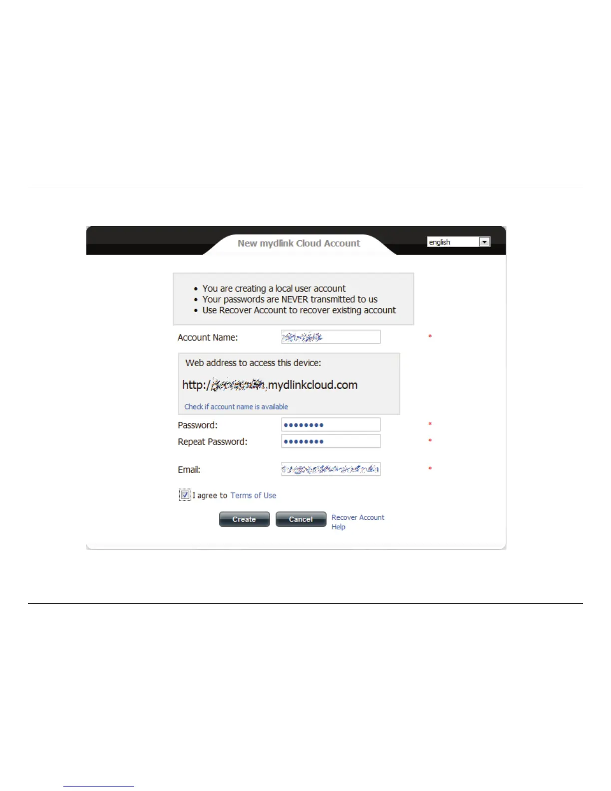 Register for a My D-Link Cloud Account. Fill in all the elds provided, agree with the Terms of Use and click the Create button.