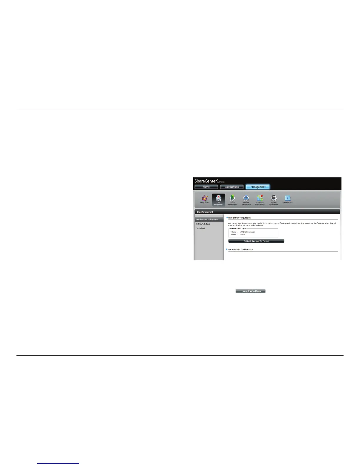 To setup the Hard Drive RAID conguration of your ShareCenter™, click on the Management tab and then the Disk Management