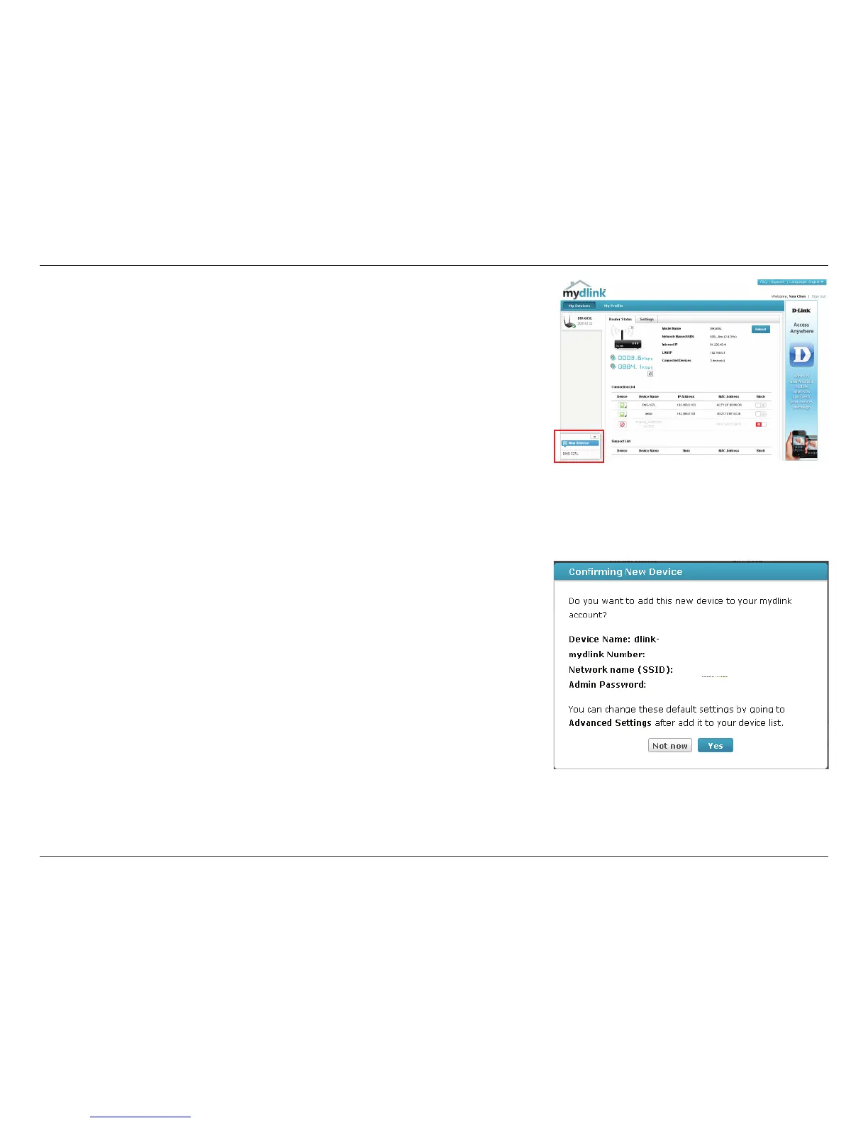 up screen displays the Device Name, mydlink number, Network Name, and