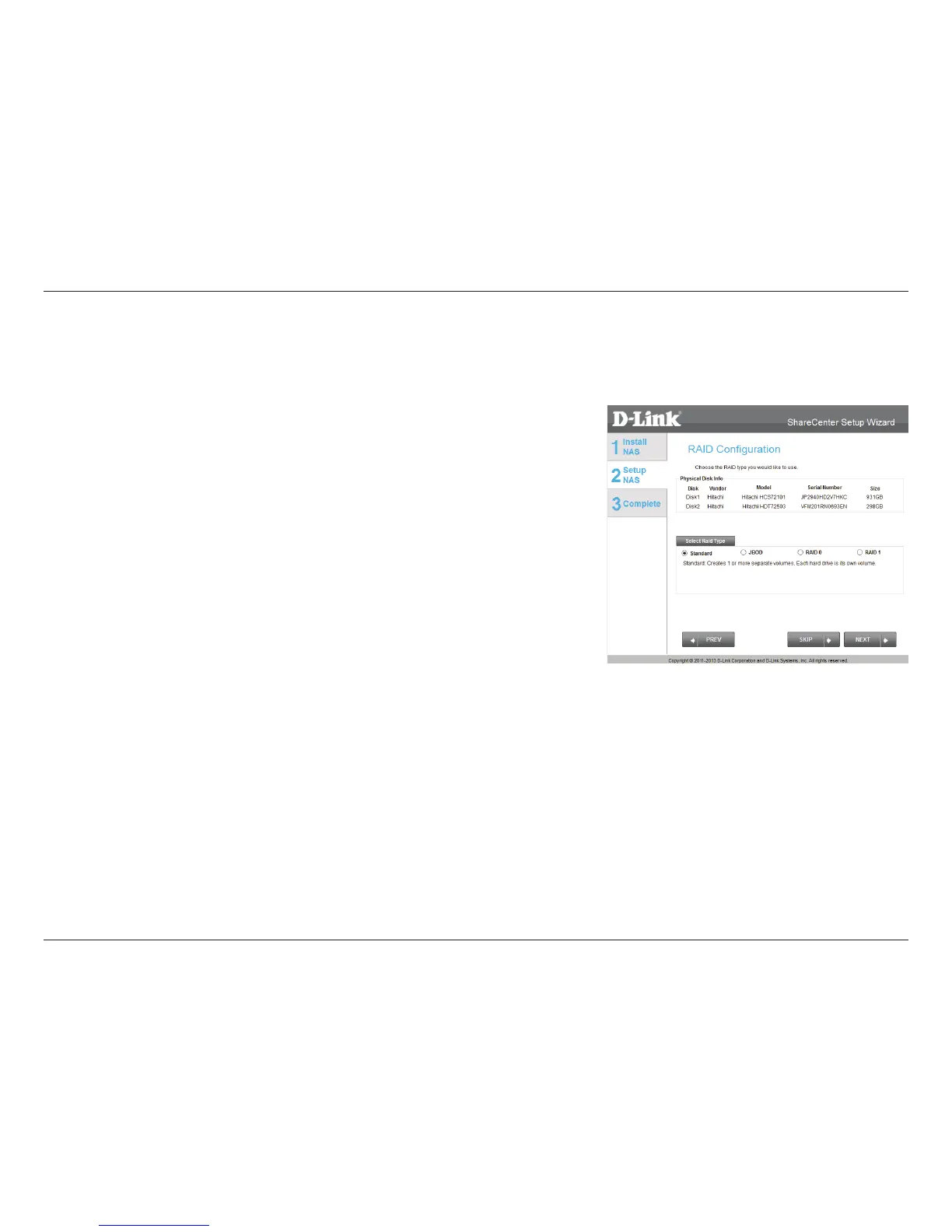 The next part of the setup wizard helps you to congure your hard drive storage. The DNS-327L oers four options for hard