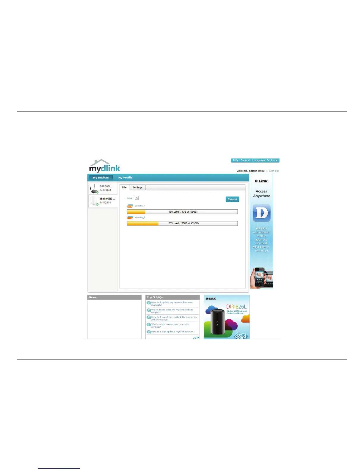 Once you are connected you can view your existing storage on the cloud and the DNS-327L. You can also upload, download les using your