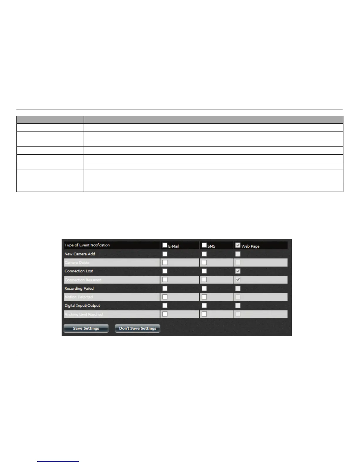 Use the checkboxes to select whether you would like each event type notication to be sent by E-mail, SMS, or Web Page.