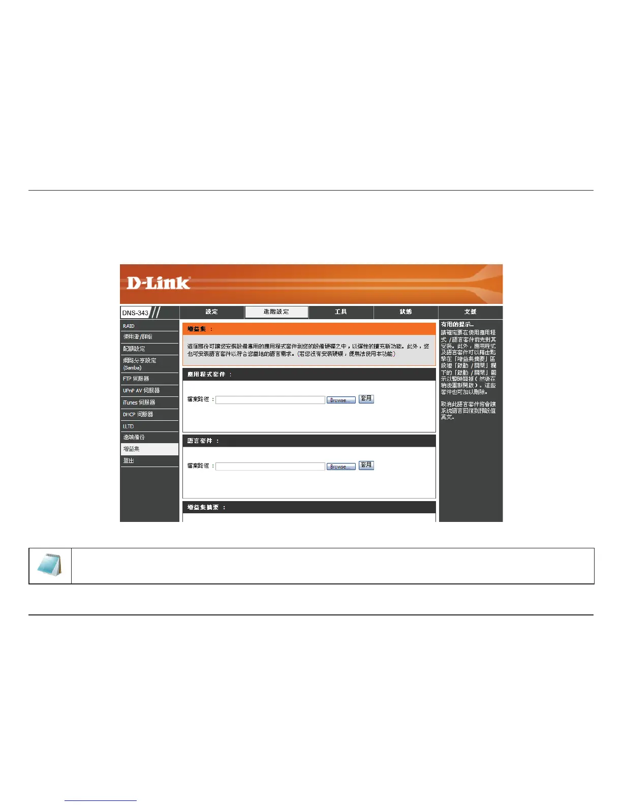 After the loading a language pack you must activate it on the Add-ons page. After activating a language pack the interface of the DNS-343 will change to the language loaded.