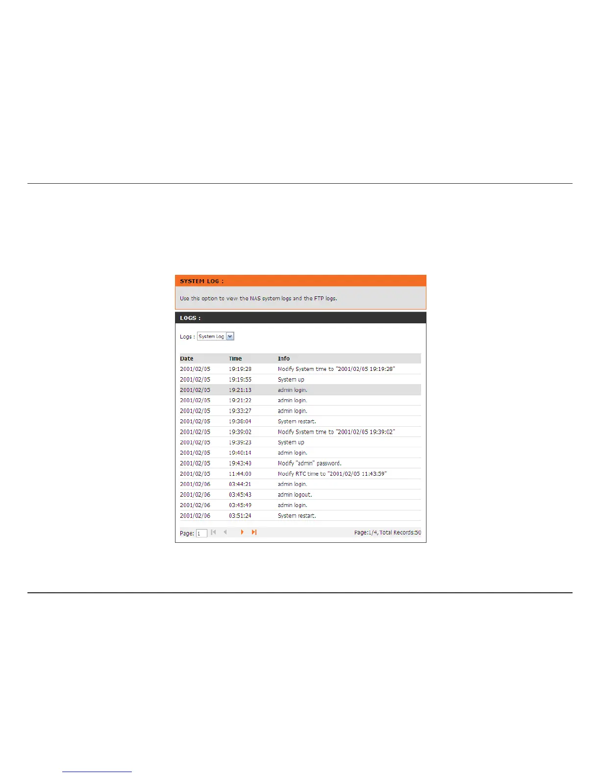 Choose System Log from the drop-down menu to view the System Log events. Choose FTP Log from the drop-down menu to view FTP Log events.