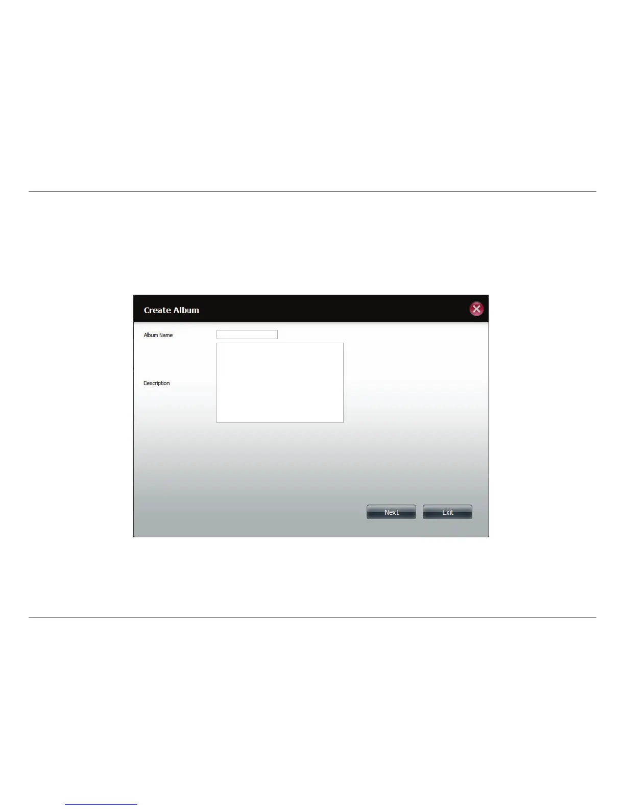 In the Album Name eld, enter your desired name and then enter a description in the Description eld. Click Next to continue.