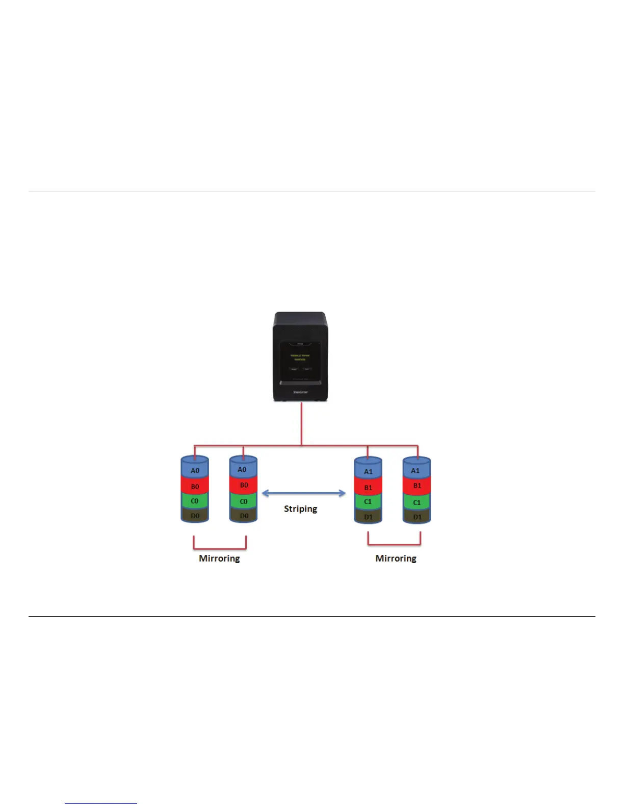 RAID 10 bands RAID 1 and RAID 0 together. This is benecial because it oers two types of security, striping and mirroring. RAID