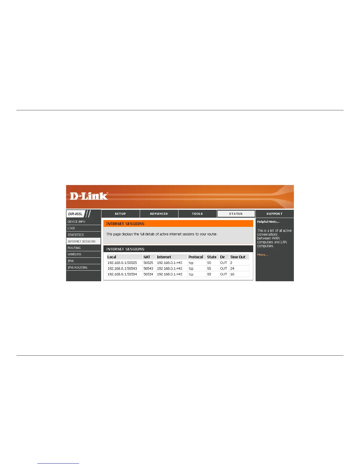 The Internet Sessions page displays full details of active Internet sessions through your router. An Internet session is a conversation