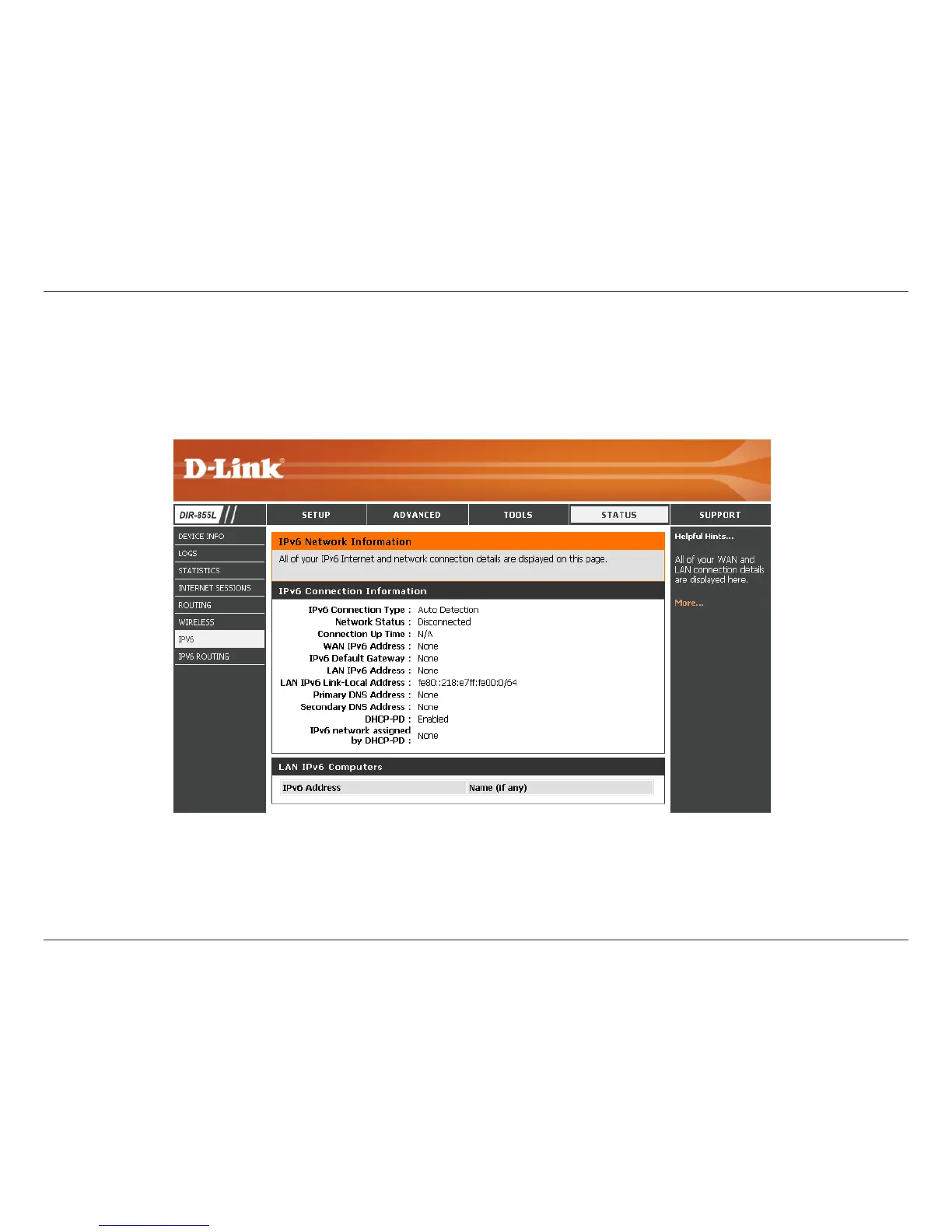The IPv6 page displays a summary of the routers IPv6 settings and lists the IPv6 address and host name of any IPv6 clients.