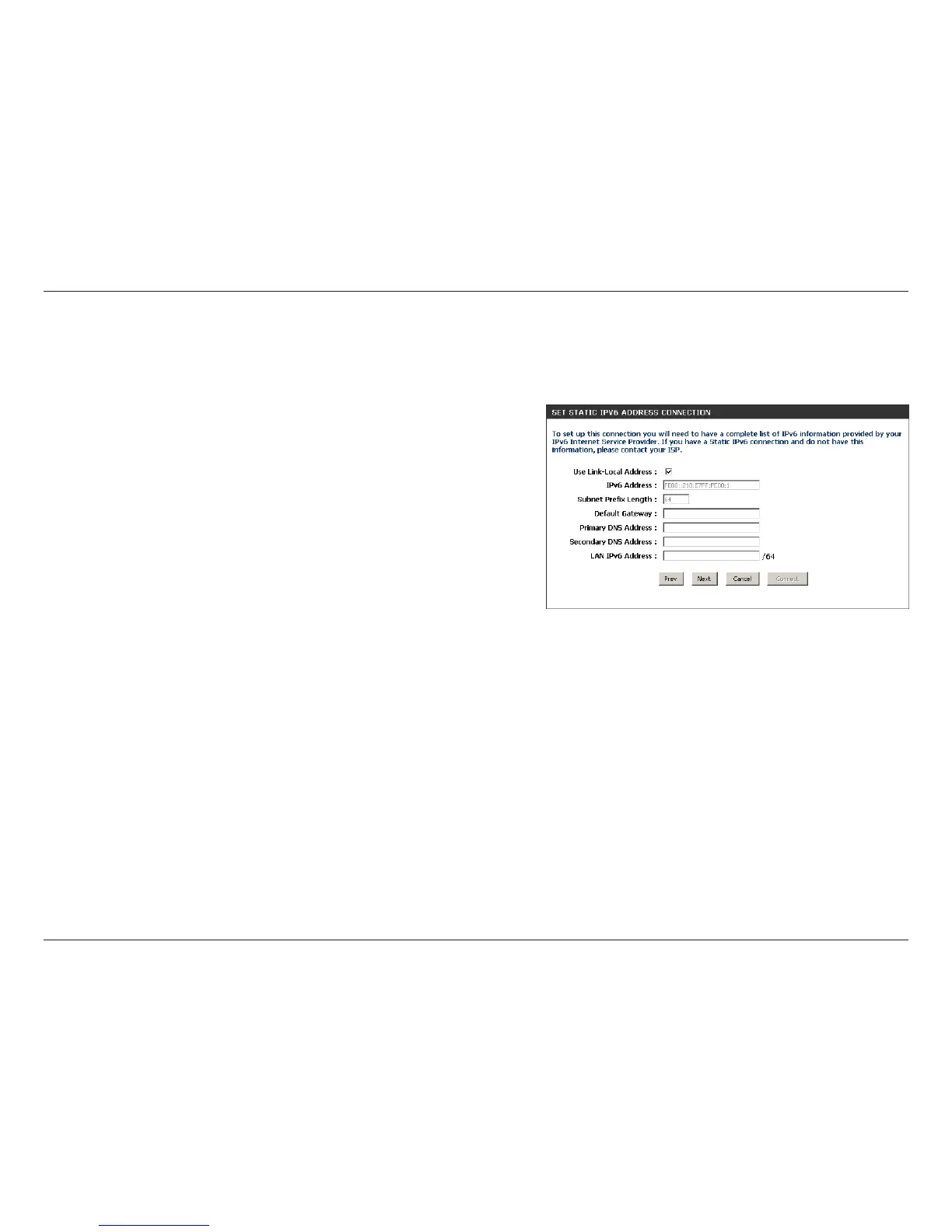 entered in your IPv6 conguration settings. You must enter the IPv6 address, Subnet Prex Length, Default Gateway, Primary DNS Server and