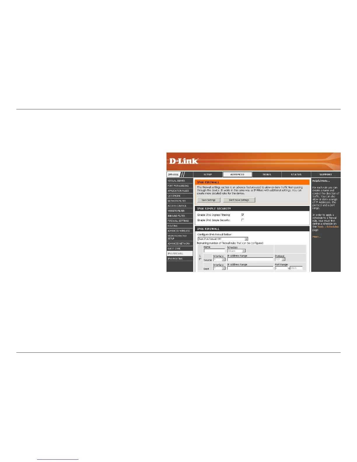 DIR-855L’s IPv6 Firewall functions in a similar way to the IP Filters feature.