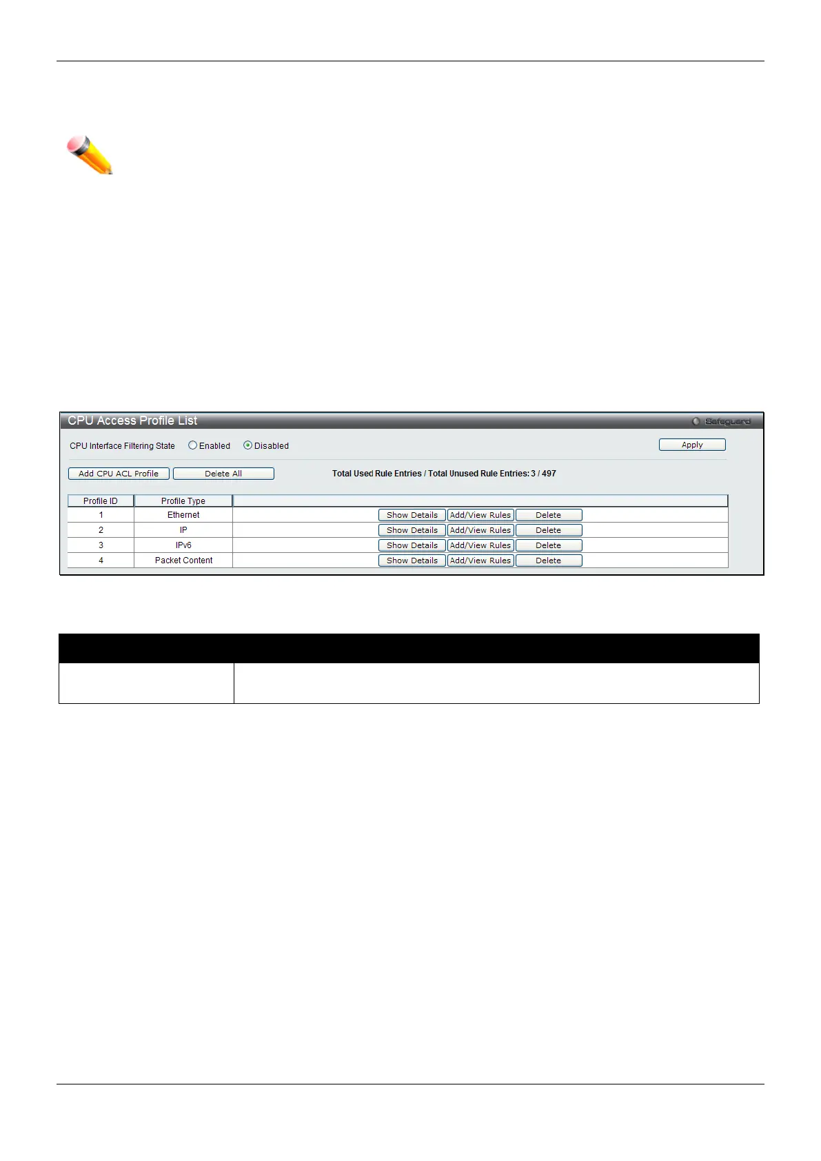 NOTE: CPU Interface Filtering is used to control traffic access to the switch directly such as protocols