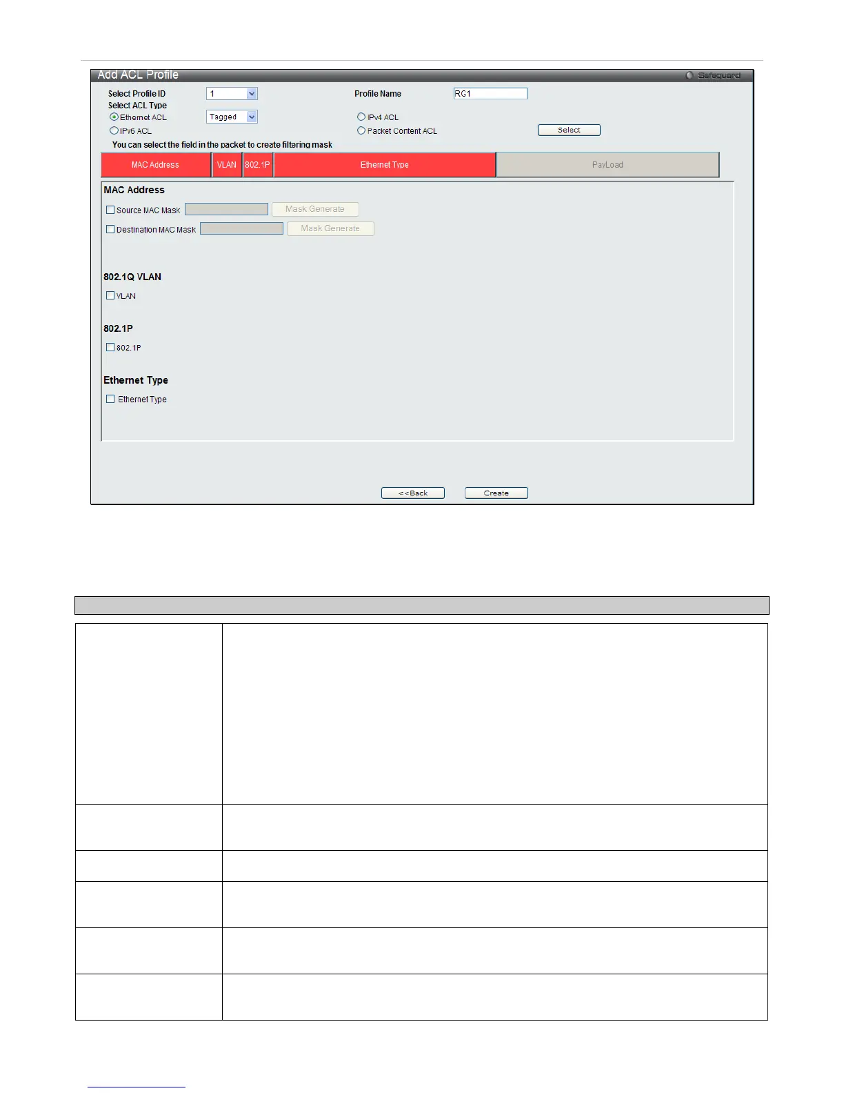 To configure this profile select the Ethernet ACL, and use the drop down menu to choose