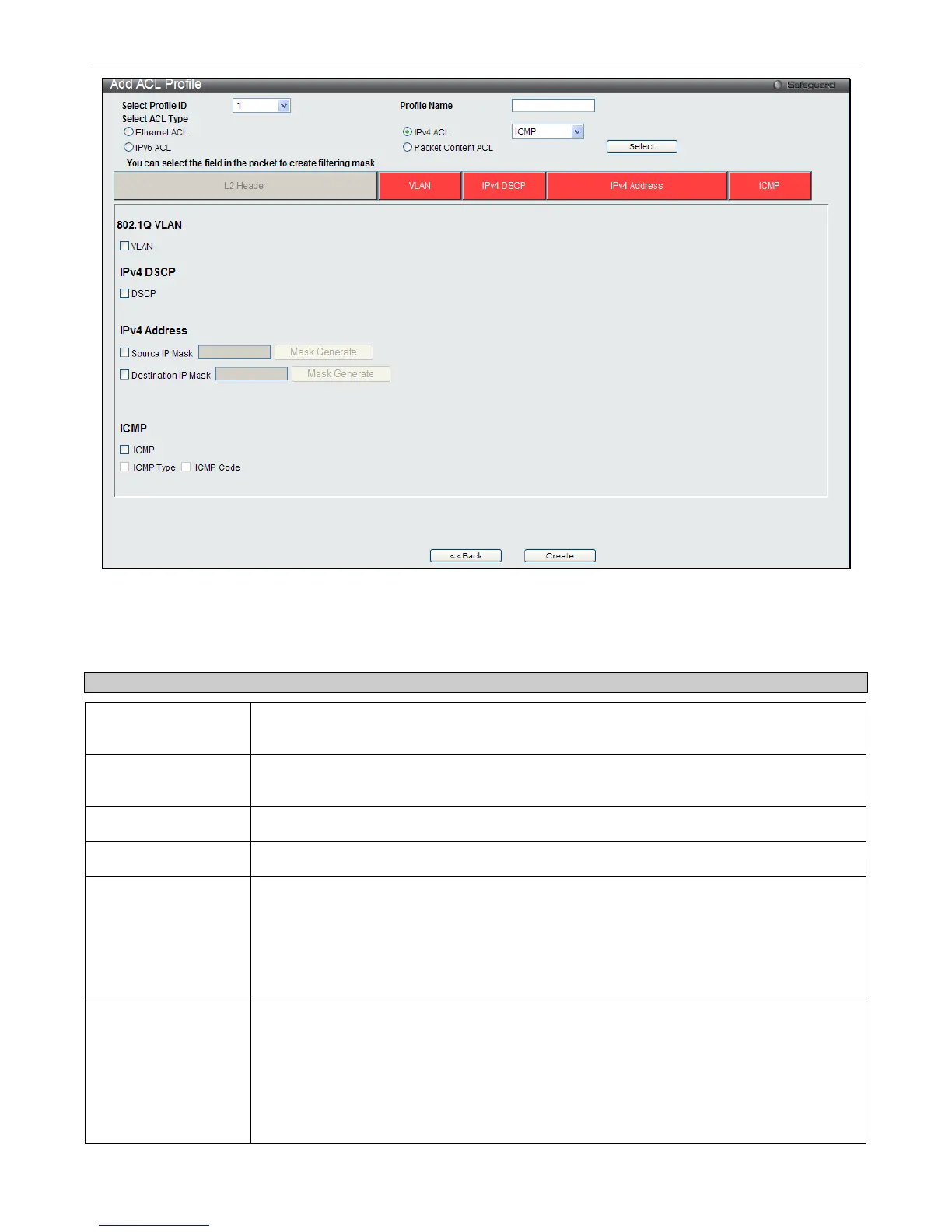 • icmp − Specifies that the Switch will examine the Internet Control Message Protocol