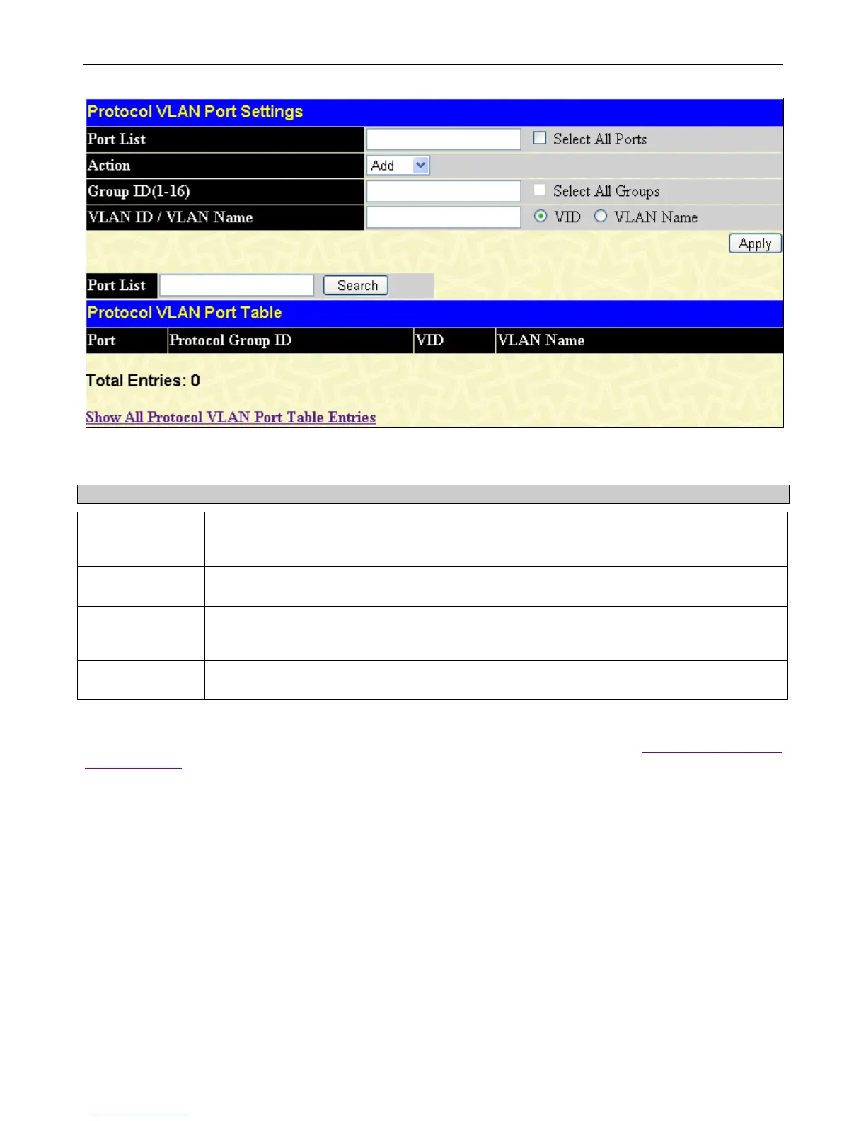 Port Table Entries link will display all Protocol VLAN Port Table entries.