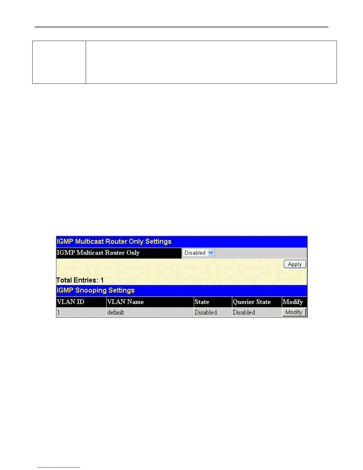 This window is used to Enable, Disable or Modify the IGMP Snooping Settings on the Switch.
