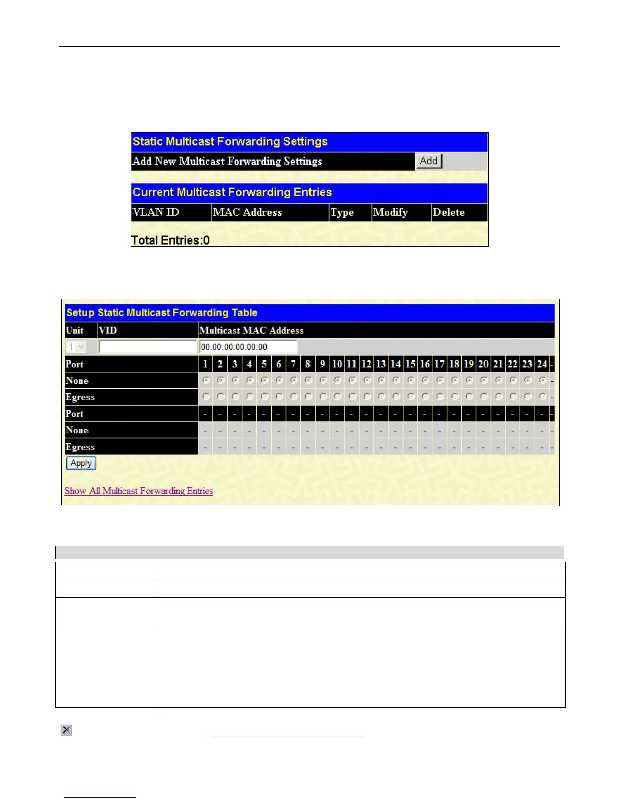 To view this window, click, L2 Features > Forwarding & Filtering >Multicast Forwarding, as shown below:
