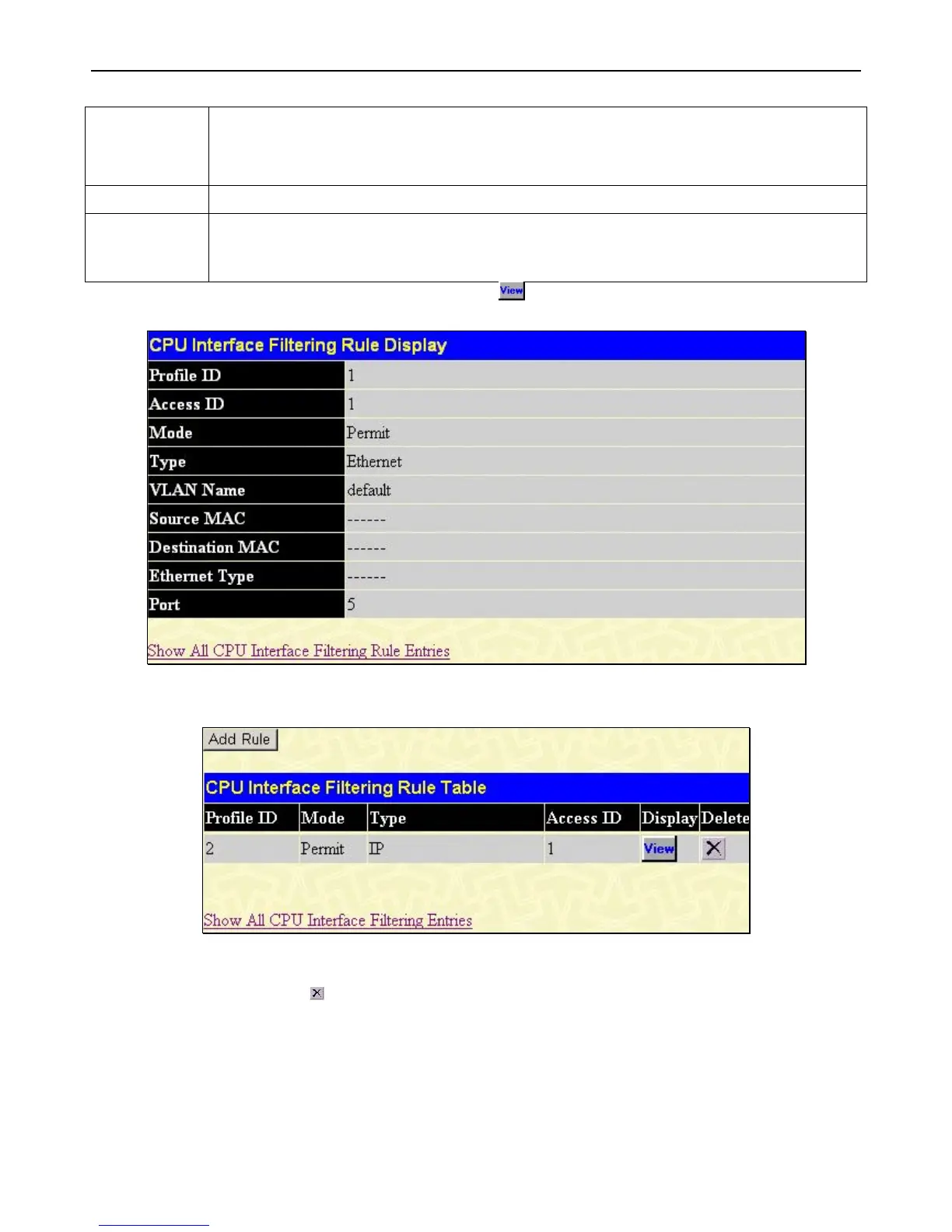 The following window is the CPU Interface Filtering Rule Table for IP.