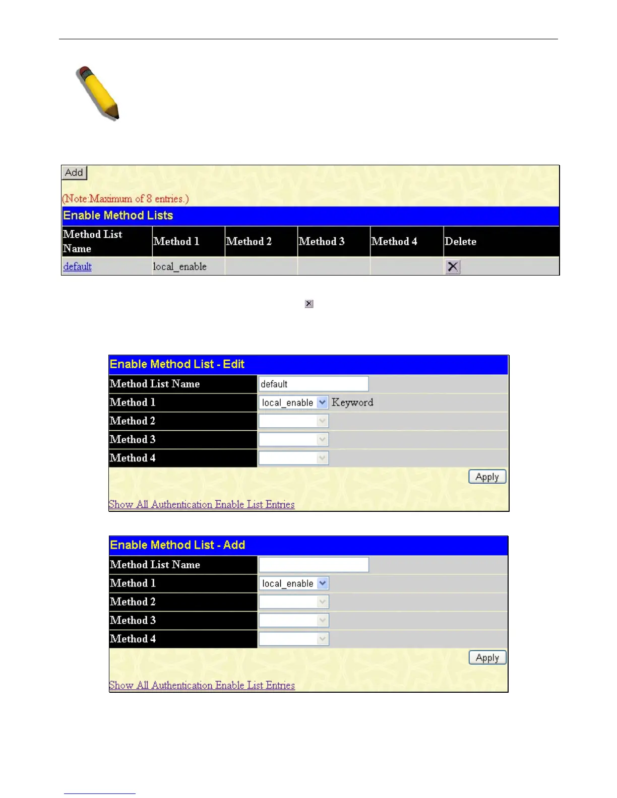 To delete an Enable Method List defined by the user, click the under the Delete heading corresponding to the entry desired to