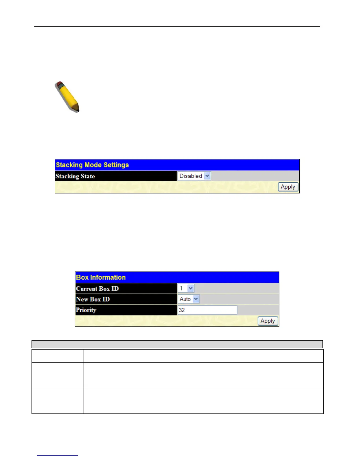 Use the drop-down menu, choose Enabled and click Apply to allow stacking of this Switch.