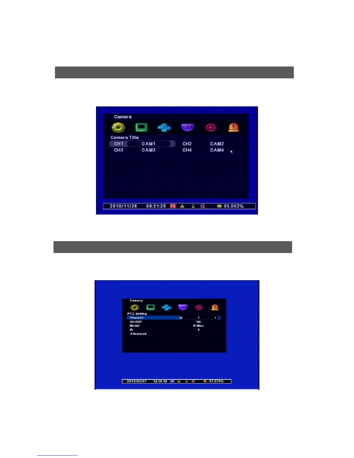 D-MAX STANDALONE H.264 - 7. Camera Setup and PTZ Control; Camera Title Configuration; PTZ Channel and ID Configuration