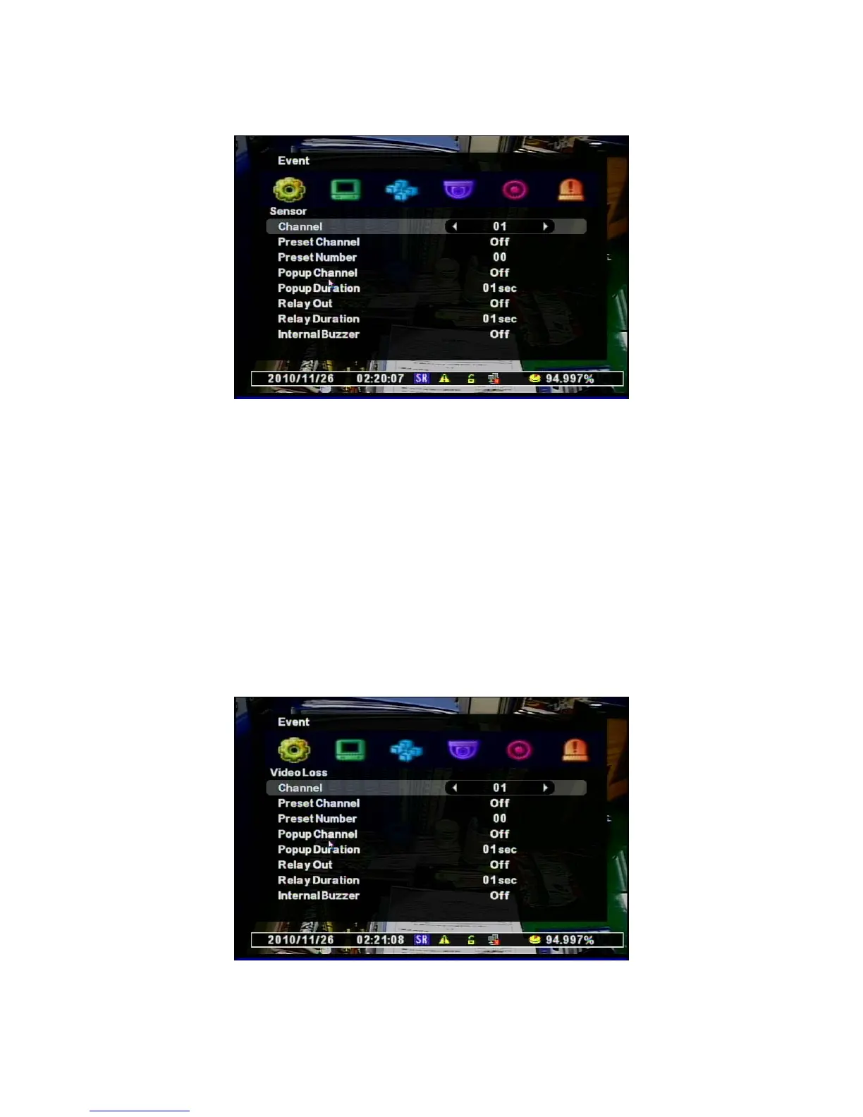 • Internal Buzzer: Selects the use of Internal Buzzer on the DVR