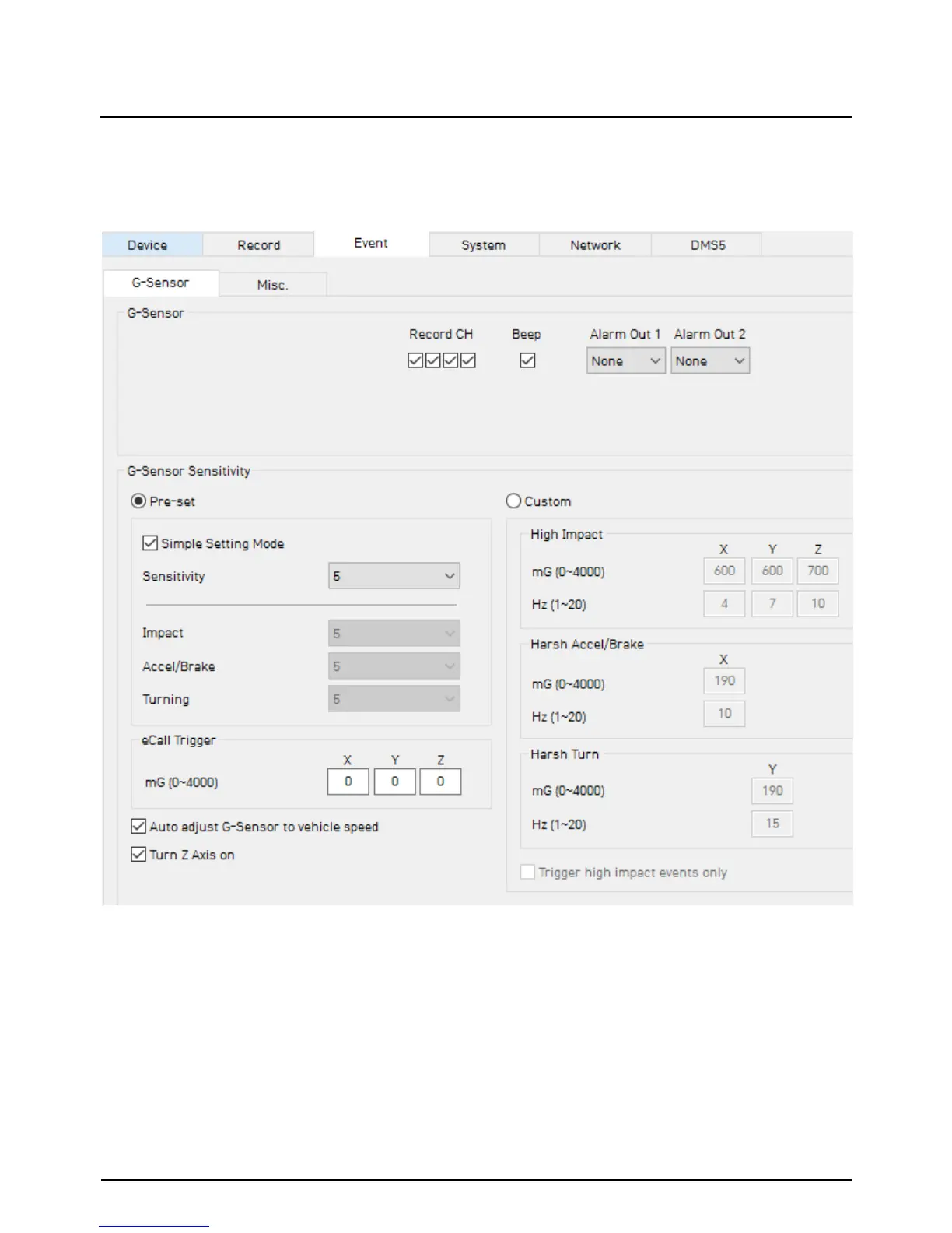 G-Sensor Sensitivity: The shock sensor sensitivity can be set to ‘Simple setting